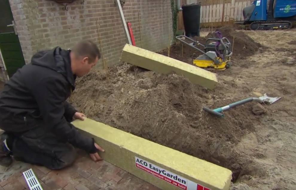 Het regenwater kan worden opgevangen in een ACO Slimline lijngoot. Door toepassing van een Rainbloxx infiltratiebuffer van 15x20 cm direct onder de ACO Slimline lijngoot hoeft er geen rioolaansluiting meer gemaakt te worden. Het regenwater wordt snel in de Rainbloxx opgenomen. Het zand onder het terras of de teelaarde in de tuin neemt op basis van capillaire zuiging het regenwater weer over. Zo houd je zonder kostbare ingrepen al het regenwater in de tuin.