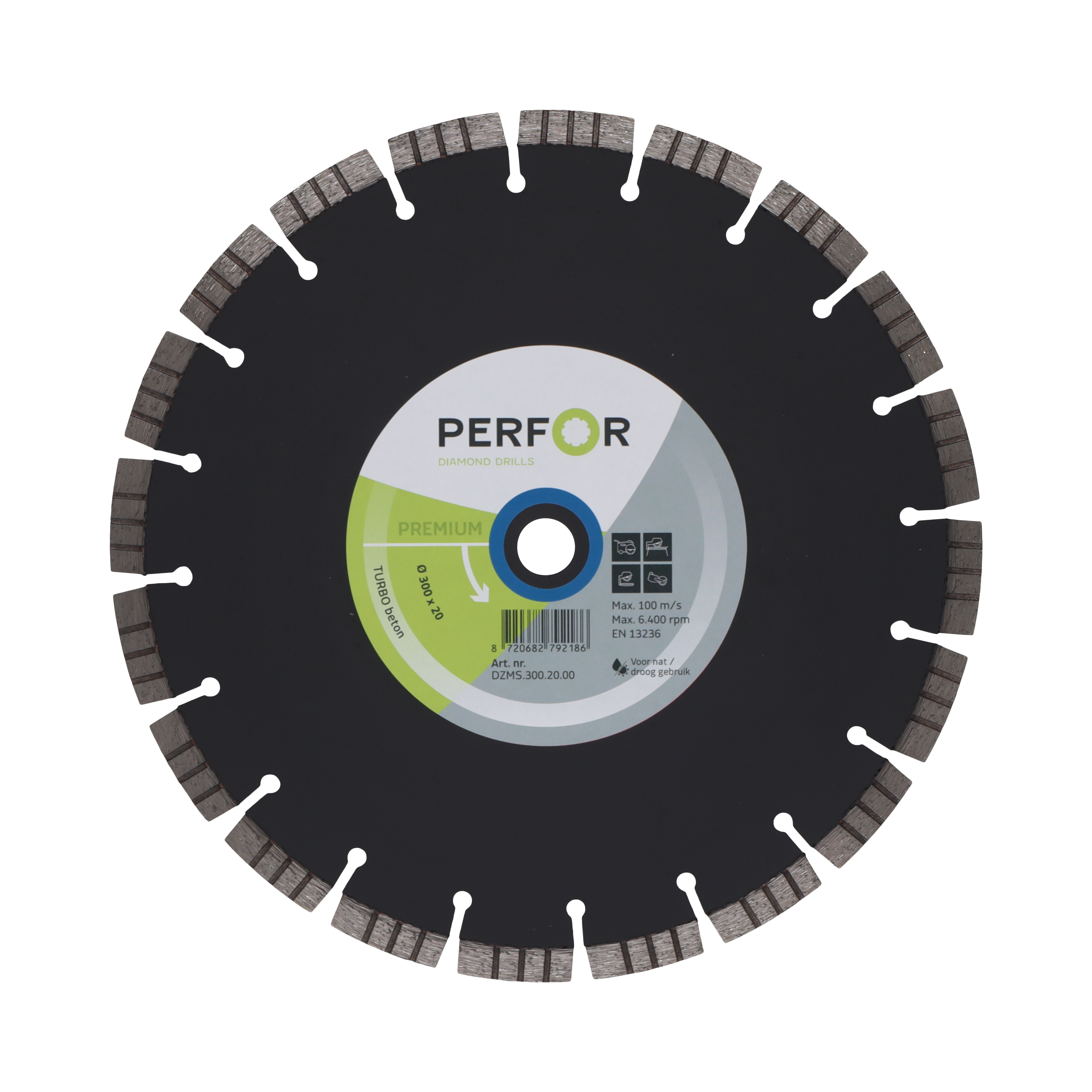 Het zaagblad TURBO beton van PERFOR is een topblad als het gaat om droog- en nat zagen in allerlei beton en (harde)steensoorten (kalkzandsteen, asfalt, steen, (beton)bandjes). Het zaagblad beschikt over een wat dikker stamblad voor extra stabiliteit. Daarnaast is het zaagblad voorzien van segmenten met een harde binding waardoor de stand tijd aanzienlijk word vergroot bij zagen in allerlei steensoorten, asfalt, betonbandjes enz. Het comfort bij droogzagen met dit zaagblad wordt bevorderd door de vorm van de segmenten (hierdoor wordt er minder wrijvingswarmte gecreëerd) en door een dikker stamblad (deze kan meer hitte hebben).
