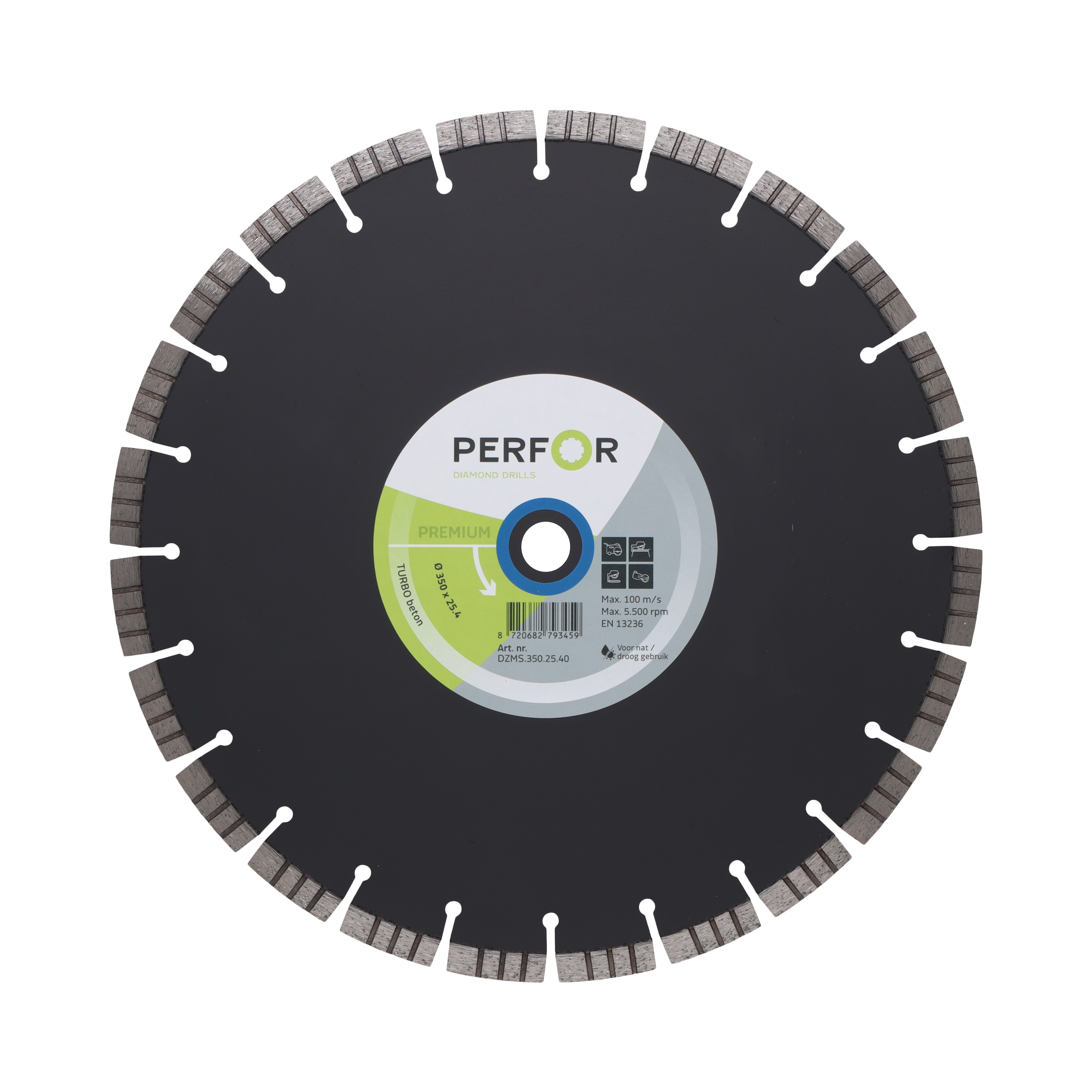 Het zaagblad TURBO beton van PERFOR is een topblad als het gaat om droog- en nat zagen in allerlei beton en (harde)steensoorten (kalkzandsteen, asfalt, steen, (beton)bandjes). Het zaagblad beschikt over een wat dikker stamblad voor extra stabiliteit. Daarnaast is het zaagblad voorzien van segmenten met een harde binding waardoor de stand tijd aanzienlijk word vergroot bij zagen in allerlei steensoorten, asfalt, betonbandjes enz. Het comfort bij droogzagen met dit zaagblad wordt bevorderd door de vorm van de segmenten (hierdoor wordt er minder wrijvingswarmte gecreëerd) en door een dikker stamblad (deze kan meer hitte hebben).