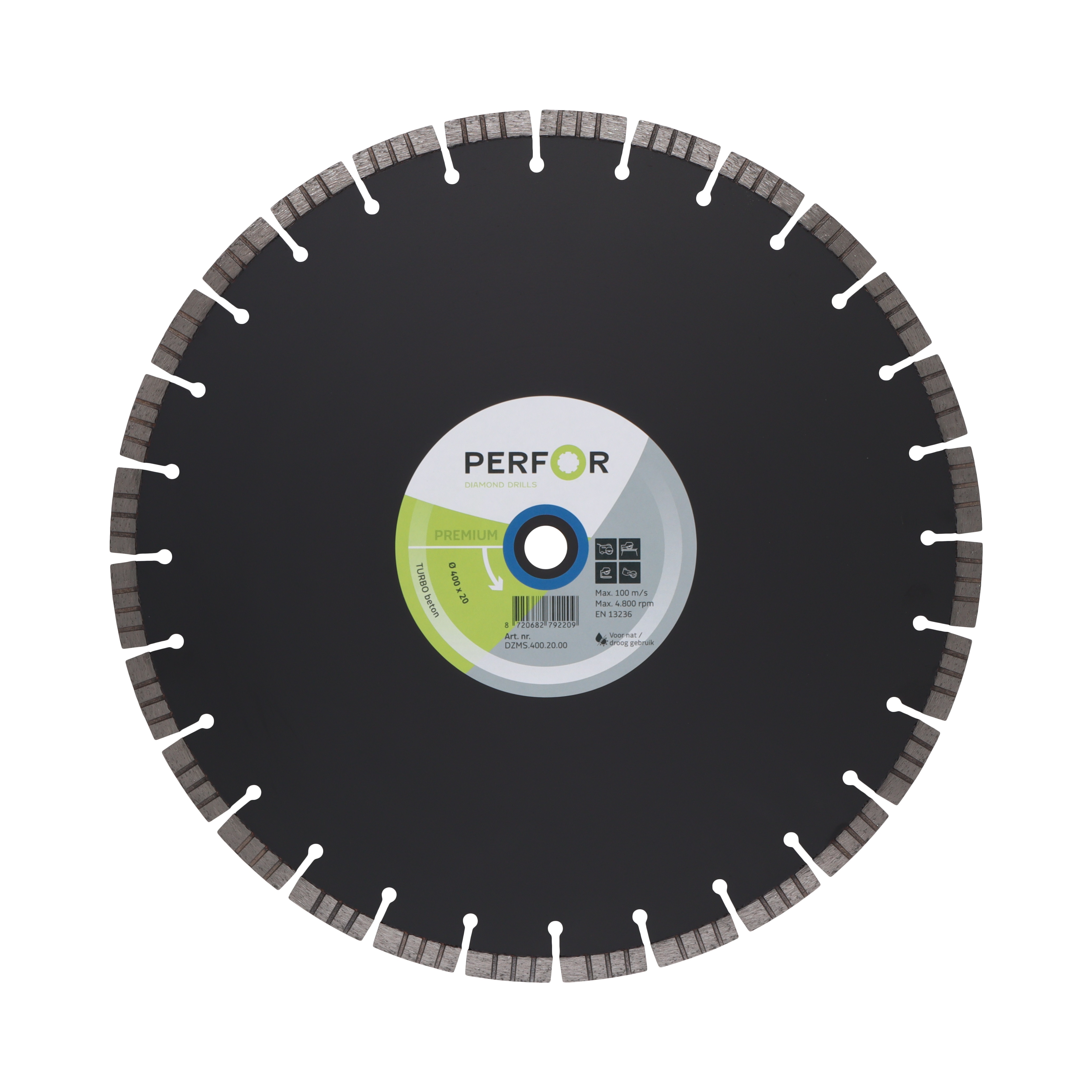 Het zaagblad TURBO beton van PERFOR is een topblad als het gaat om droog- en nat zagen in allerlei beton en (harde)steensoorten (kalkzandsteen, asfalt, steen, (beton)bandjes). Het zaagblad beschikt over een wat dikker stamblad voor extra stabiliteit. Daarnaast is het zaagblad voorzien van segmenten met een harde binding waardoor de stand tijd aanzienlijk word vergroot bij zagen in allerlei steensoorten, asfalt, betonbandjes enz. Het comfort bij droogzagen met dit zaagblad wordt bevorderd door de vorm van de segmenten (hierdoor wordt er minder wrijvingswarmte gecreëerd) en door een dikker stamblad (deze kan meer hitte hebben).