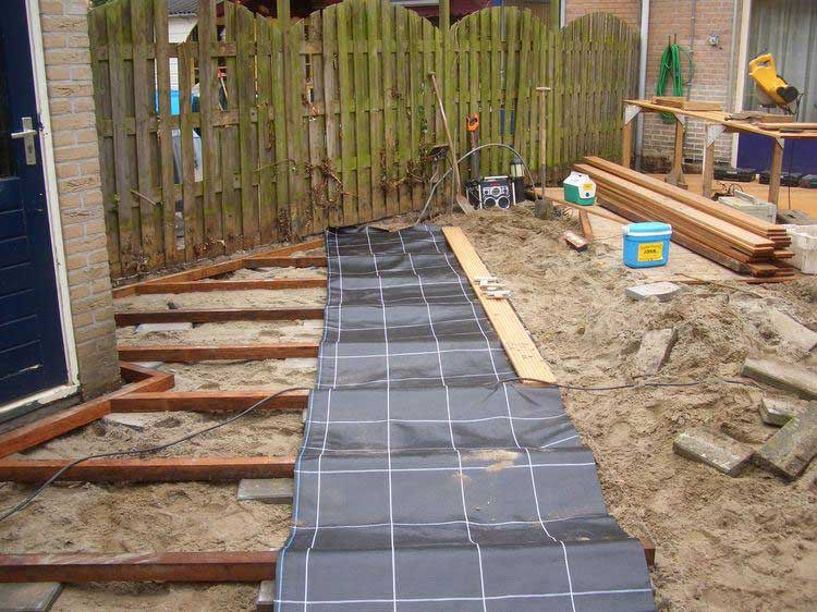 Anti worteldoek is geweven uit zwart plastic. Het heeft als voordeel dat het wel water maar geen licht en wortelgroei doorlaat. Er zijn vele toepassingen voor anti worteldoek: Onder halfverharding: Anti worteldoek is bij uitstek geschikt om onkruidgroei bij halfverhardingen te voorkomen. Grind, split, houtsnippers of andere half verhardingen worden vaak rechtstreeks op de aarde of het zand aangebracht waardoor het onkruid van onder af door de halfverharding heen groeit. Onkruidbestrijding zonder te grijpen naar chemische middelen wordt dan bijna onmogelijk. Hou wel rekening met een laag van minimaal 5 cm bovenop het anti worteldoek. Zo voorkom je dat het anti worteldoek omhoog komt. Onder bestrating: Anti worteldoek om onkruidgroei tussen de bestrating tegen te gaan is volkomen onzinnig. Dit wordt slechts uit commercieel oogpunt aangeraden of door onvoldoende vakkennis. Onkruid wat tussen de bestrating groeit ontstaat door zaden die van boven af op de bestrating vallen en ontkiemen tussen de voegen van de stenen. Je kunt wel anti worteldoek onder het straatwerk leggen als je veel last hebt van mollen of muizen. Deze graven gangen onder uw nieuwe straatwerk en er zullen dan verzakkingen ontstaan. Door gebruik van anti worteldoek zullen de stenen waaronder de gangen zijn gegraven opgevangen worden door het doek waardoor eventuele verzakkingen minder erg zullen zijn. Ook is door het gebruik van doek onder de bestrating de drukverdeling gunstiger. Op een talud: Een tuin met een talud wordt vaak als een groot probleem ervaren. Er is een vrij simpele manier om een talud te beplanten zonder dat je op die lastige schuine helling onkruid hoeft te wieden. Zorg in eerste instantie dat het talud vrij is van obstakels, onkruid en andere beplanting. Hark het talud mooi egaal en verwijder eventuele bulten en kuilen met een panschop. Rol nu het anti worteldoek uit over het talud. Je kan het anti worteldoek het beste om de 50 cm vastzetten met tentharingen. Om kosten te besparen kan je natuurlijk ook stevig ijzerdraad ombuigen tot "U" vormen die je door het anti worteldoek heen prikt ook kun je tegels her en der op het anti worteldoek leggen. Knip nu op de plaatsen waar je een plantje wil planten een rond gat in het anti worteldoek (hoe kleiner hoe beter). Vervolgens plant je de planten in de geknipte gaten in het doek. Een aangeplant talud ziet er niet alleen mooi uit, de wortelgroei van de planten geeft stevigheid aan het talud en voorkomt uitspoeling van de aarde. Achter een beschoeiing of damwand: Als je een houten beschoeiing gaat aanleggen hou er dan rekening mee dat aarde en zand door de kieren kunnen uitspoelen wat lelijke verzakkingen tot gevolg heeft. Om dit te voorkomen kun je het beste anti worteldoek achter de beschoeiing maken. Onder een vlonder of onder hardhouten tegels: Groei van onkruid onder en tussen de vlonderplanken of hardhouten tegels kunt u voorkomen door een laag antiworteldoek onder de vlonderplanken te leggen.