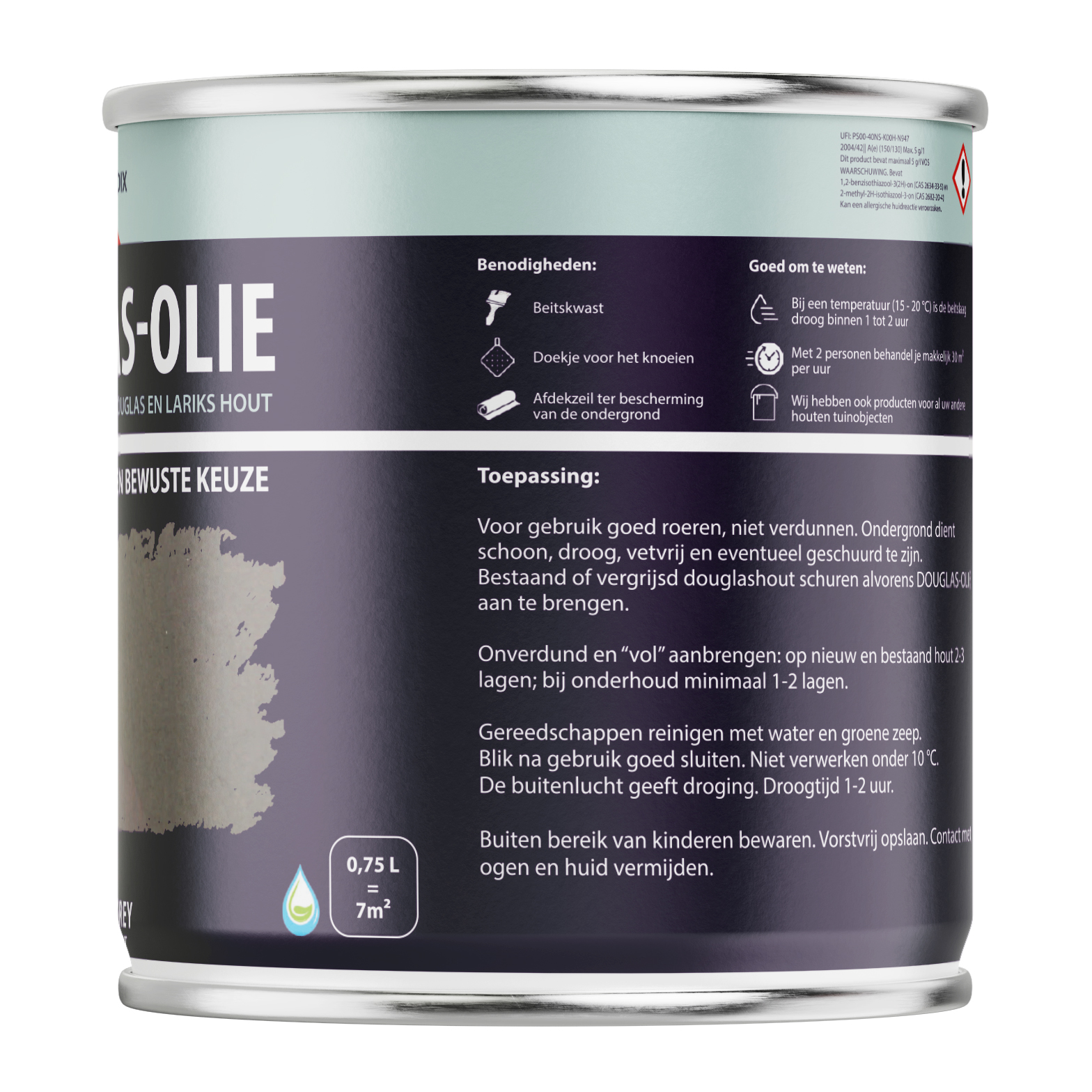 Hermadix Douglas / Lariks olie Dim grey is speciaal ontwikkeld voor nieuw en oud douglas / lariks hout. Douglas / Lariks olie geeft een transparante uitstraling zodat de houtnerf en houtstructuur zichtbaar blijven. Douglas / Lariks olie dringt diep in het hout en geeft een matte, natuurlijke uitstraling. Douglas / Lariks olie droogt snel en is makkelijk verwerkbaar. 1-2 lagen douglas / lariks olie zijn voldoende voor een prachtig resultaat. Bij onderhoudslagen lichtjes tussendoor schuren. Douglas / lariks olie is een watergedragen, mens- en milieuvriendelijk olie op basis van natuurlijke ingrediënten.