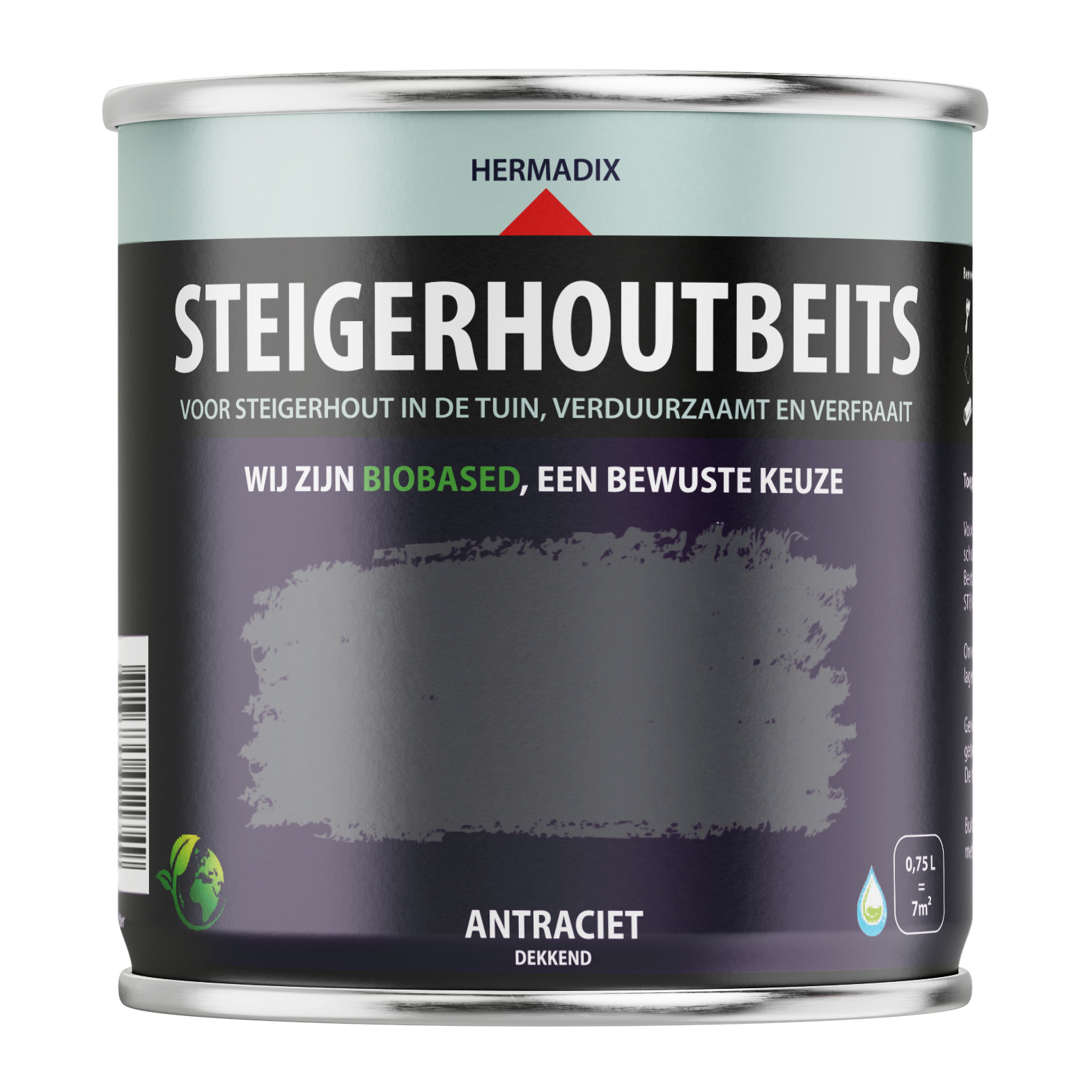 Hermadix Steigerhoutbeits antraciet is speciaal ontwikkeld voor nieuw en oud steigerhout. Steigerhoutbeits is een transparante beits die goed indringt in het hout. Steigerhoutbeits droogt snel en is makkelijk verwerkbaar. 1 laag Steigerhoutbeits is voldoende voor een prachtig resultaat. Bij onderhoudslagen hoeft niet geschuurd te worden. Steigerhoutbeits is een watergedragen, mens- en milieuvriendelijke beits op basis van natuurlijke oliën.