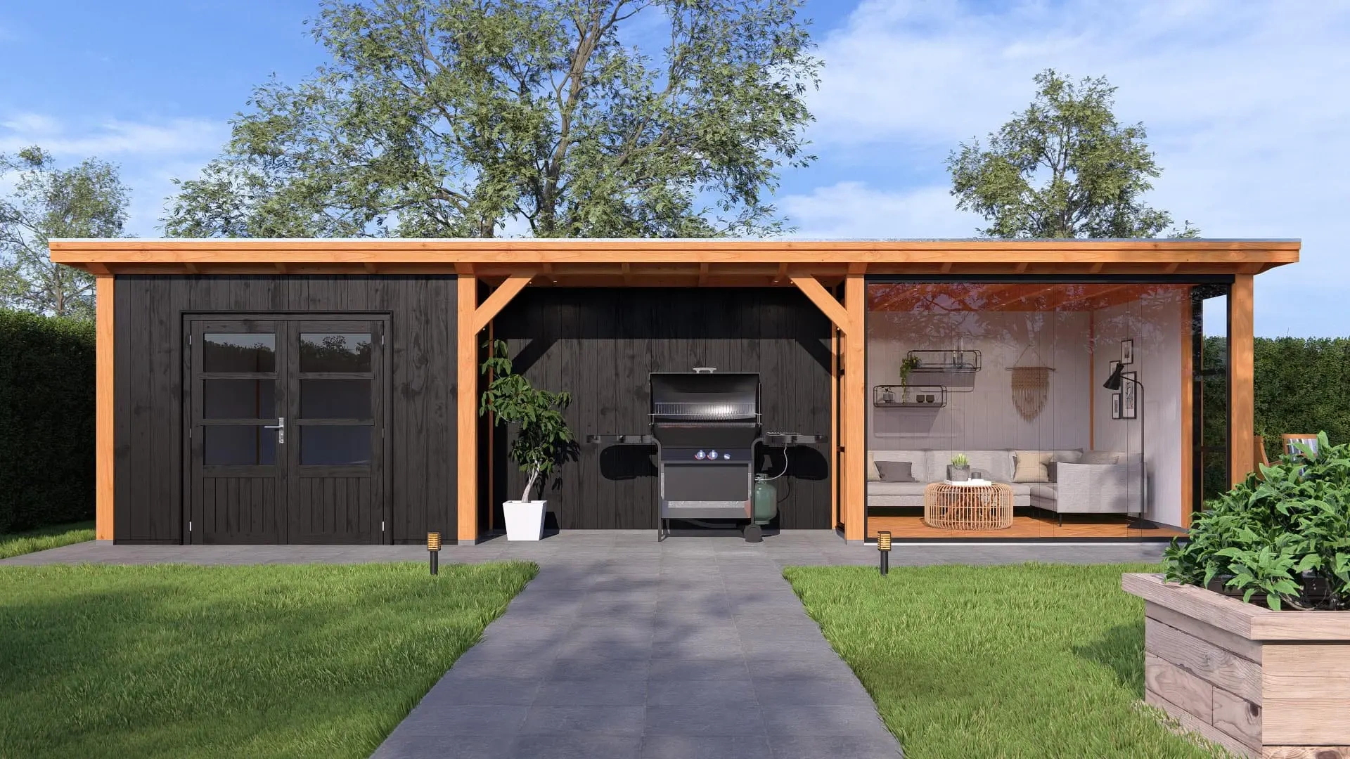 Dit buitenverblijf Barcelona is onbehandeld en de wanden zijn dubbelwandig bekleed met aan de buitenzijde zwarte potdeksel wanden en aan de binnenzijde witte sponning wanden. Aan de voorzijde is er gekozen voor een glazen schuifwand die je in de zomer lekker kan open zetten en in de winter dicht kan schuiven om de warmte binnen te houden. Daarnaast is er een mooie ruimte gecreëerd voor de BBQ.