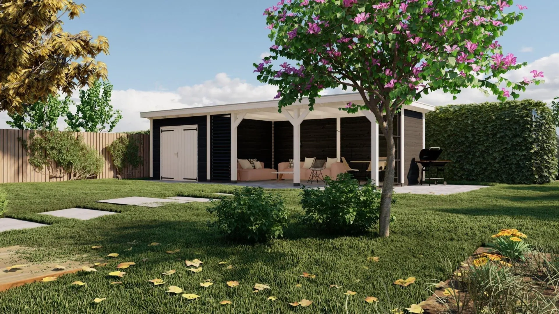 De sfeervolle overkapping is voorzien van een shutter in de voorzijde en een steellook glaswand in de rechterzijde.