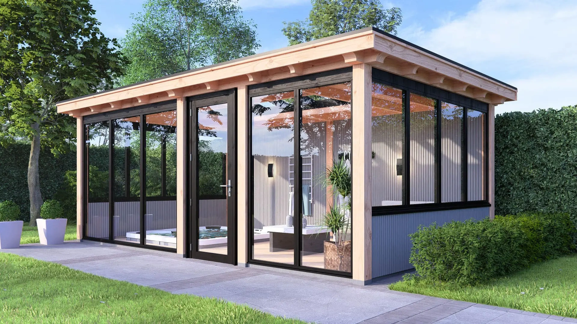 Deze variant van het buitenverblijf Brussel heeft een onbehandelde/zwart gespoten constructie en is voorzien van een zwarte daktrim.