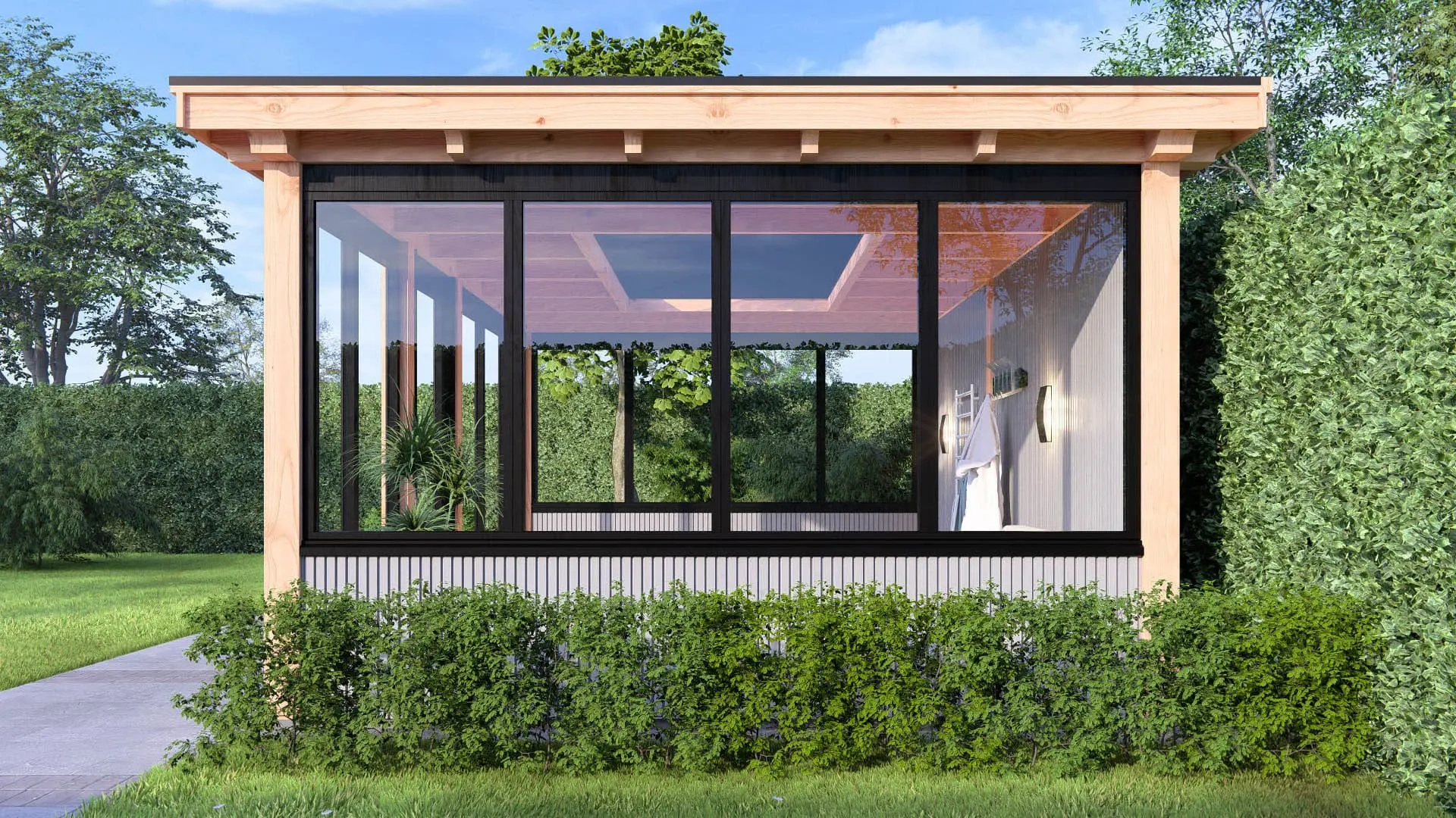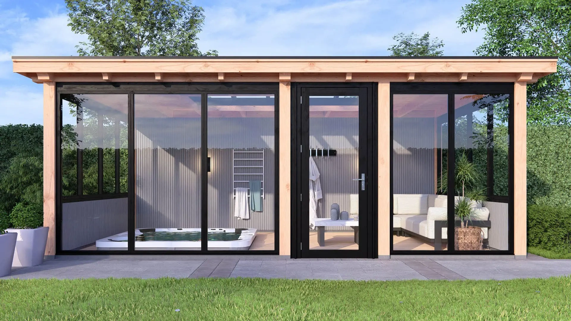 Om dit buitenverblijf een chique en exclusieve uitstraling te geven is deze voorzien van steellook ramen/deuren.