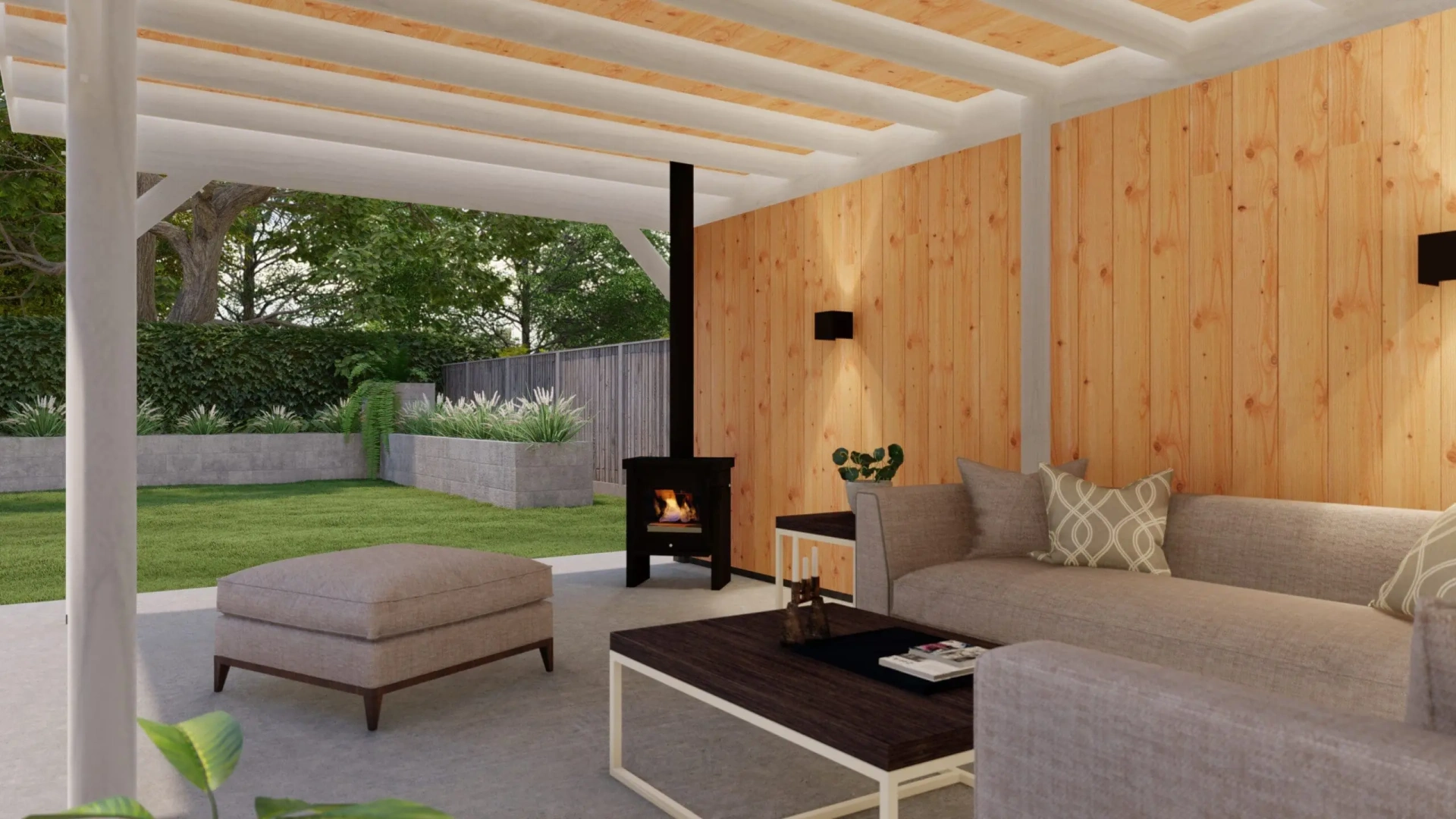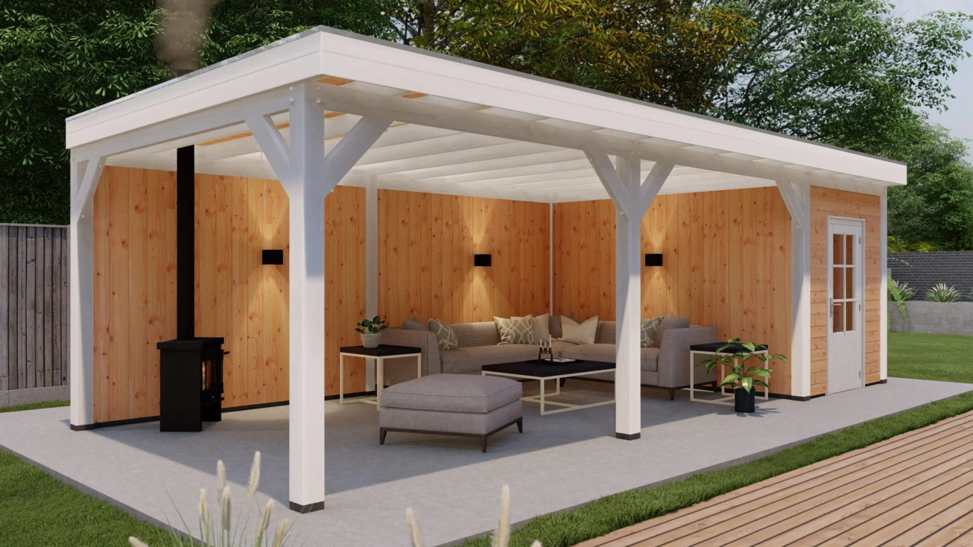 Deze Lyon is een elegante Douglas houten constructie die harmonieus opgaat in de omgeving. De wanden zijn vormgegeven met onbehandelde sponningplanken, die een traditionele en robuuste uitstraling geven.