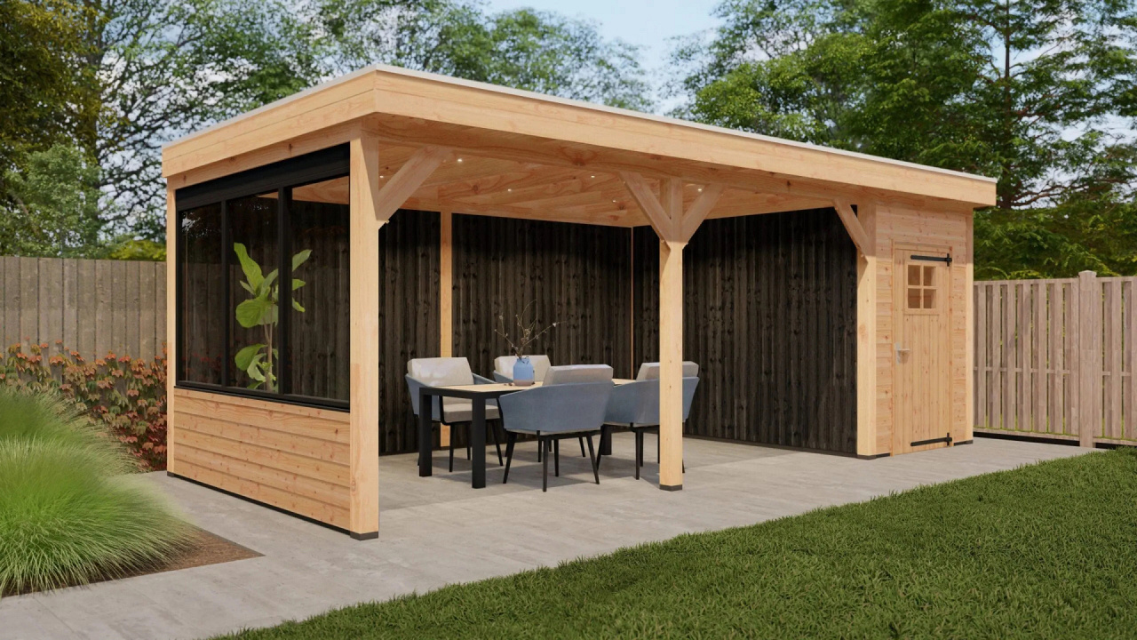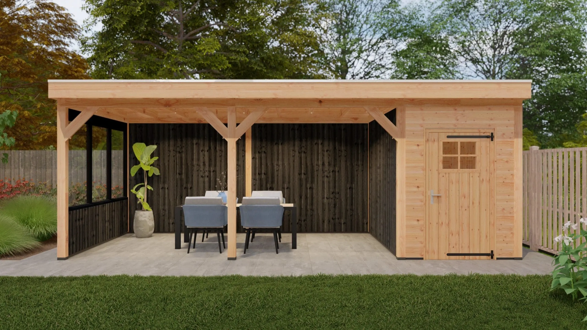 Deze Nantes is een elegante Douglas houten constructie die harmonieus opgaat in de omgeving. De wanden zijn vormgegeven met zwarte sponningplanken, die een robuuste uitstraling geven.