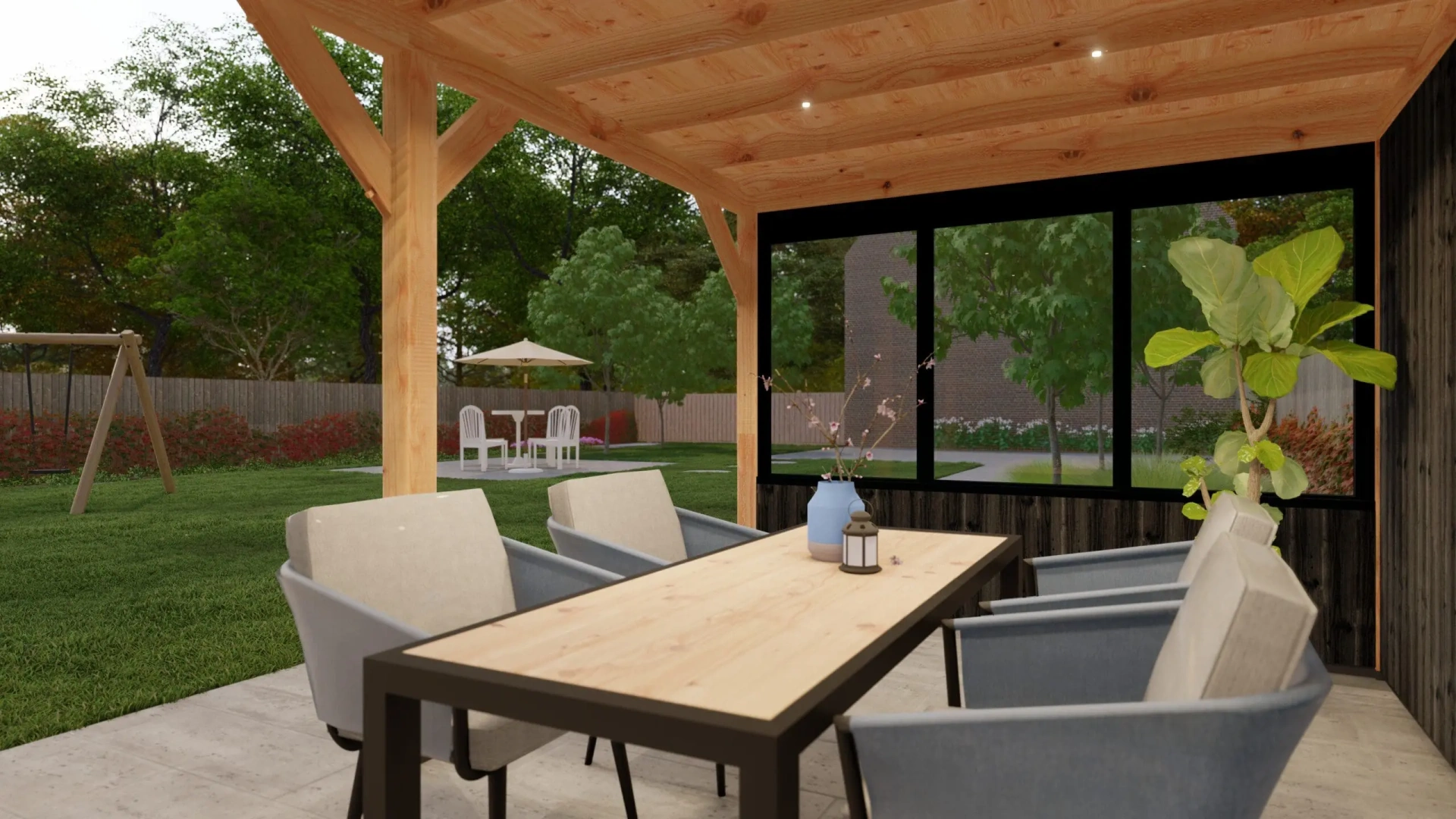 De onbehandelde constructie geeft een traditionele twist aan het geheel. Aan de rechterzijde is er gekozen voor een berging.