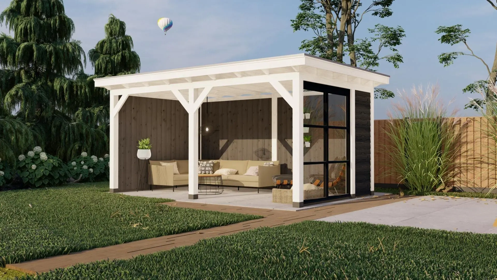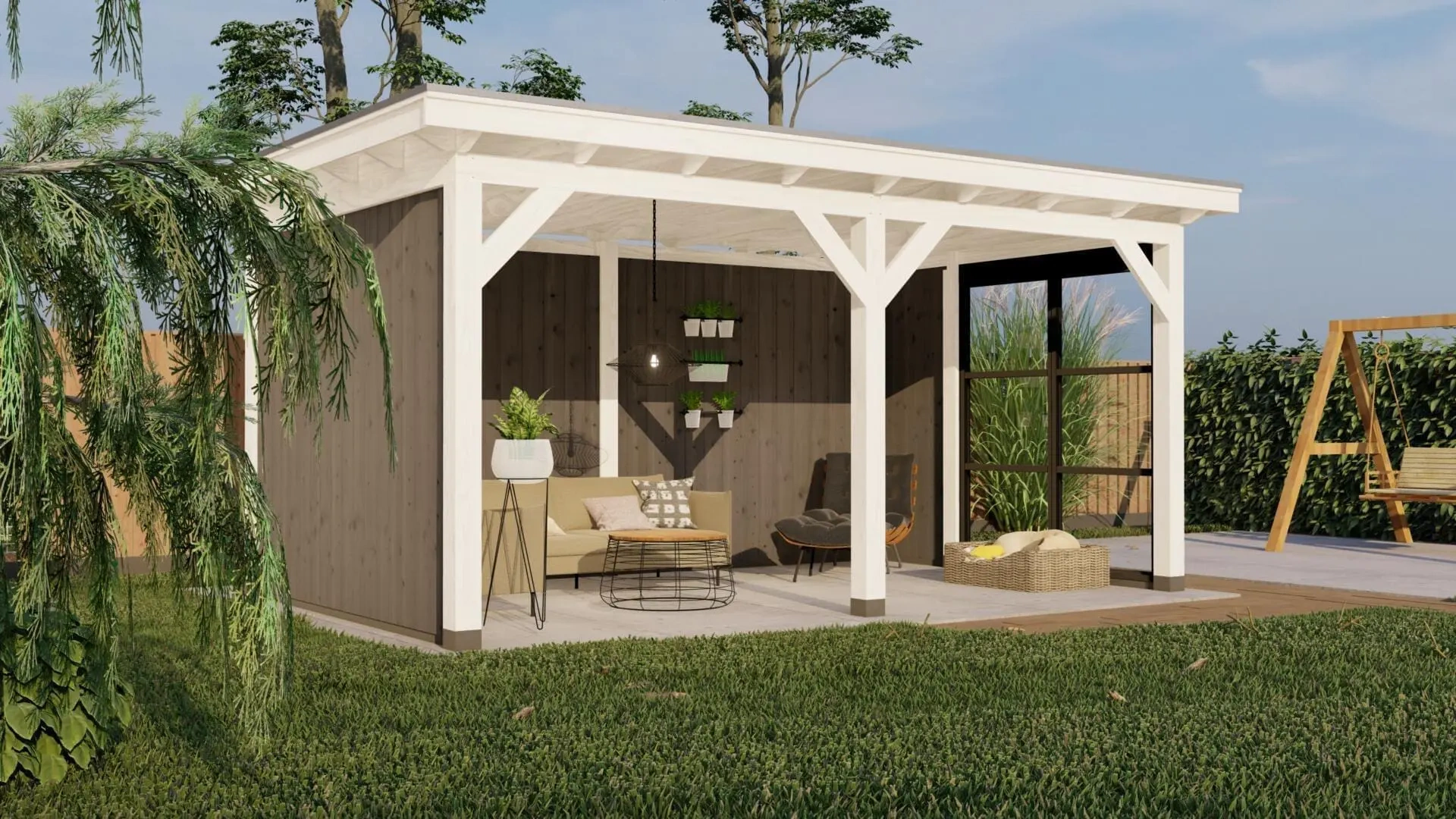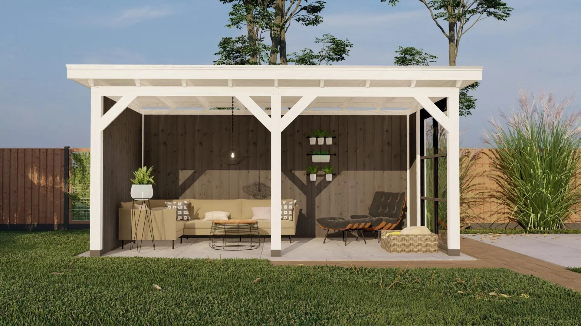 Deze variant van de Parijs L is uitgevoerd met een witte constructie en dubbelzijdig bekleed met grijze sponningplanken.