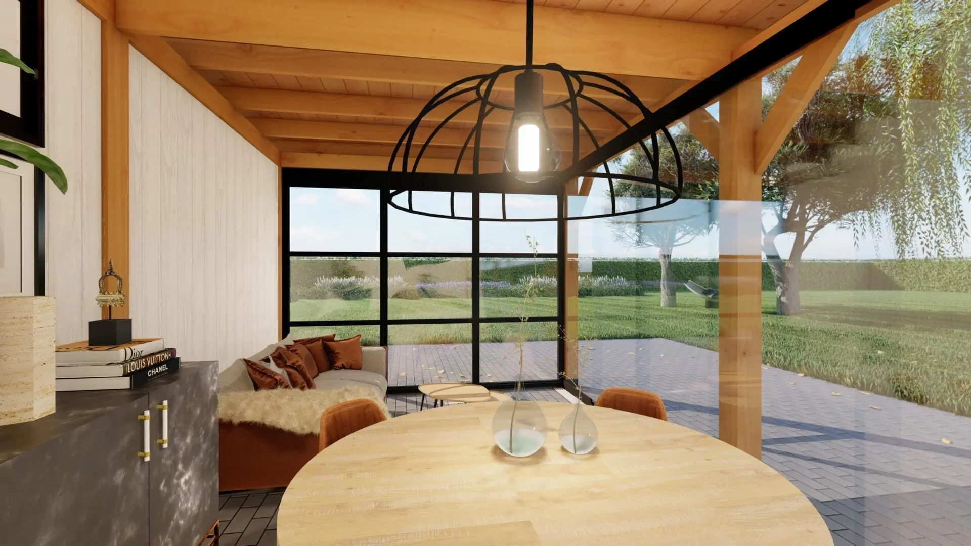 De combinatie met een glazen schuifwand, een steellook glaswand en een enkele steellook glasdeur geven dit buitenverblijf een moderne en exclusieve uitstraling.
