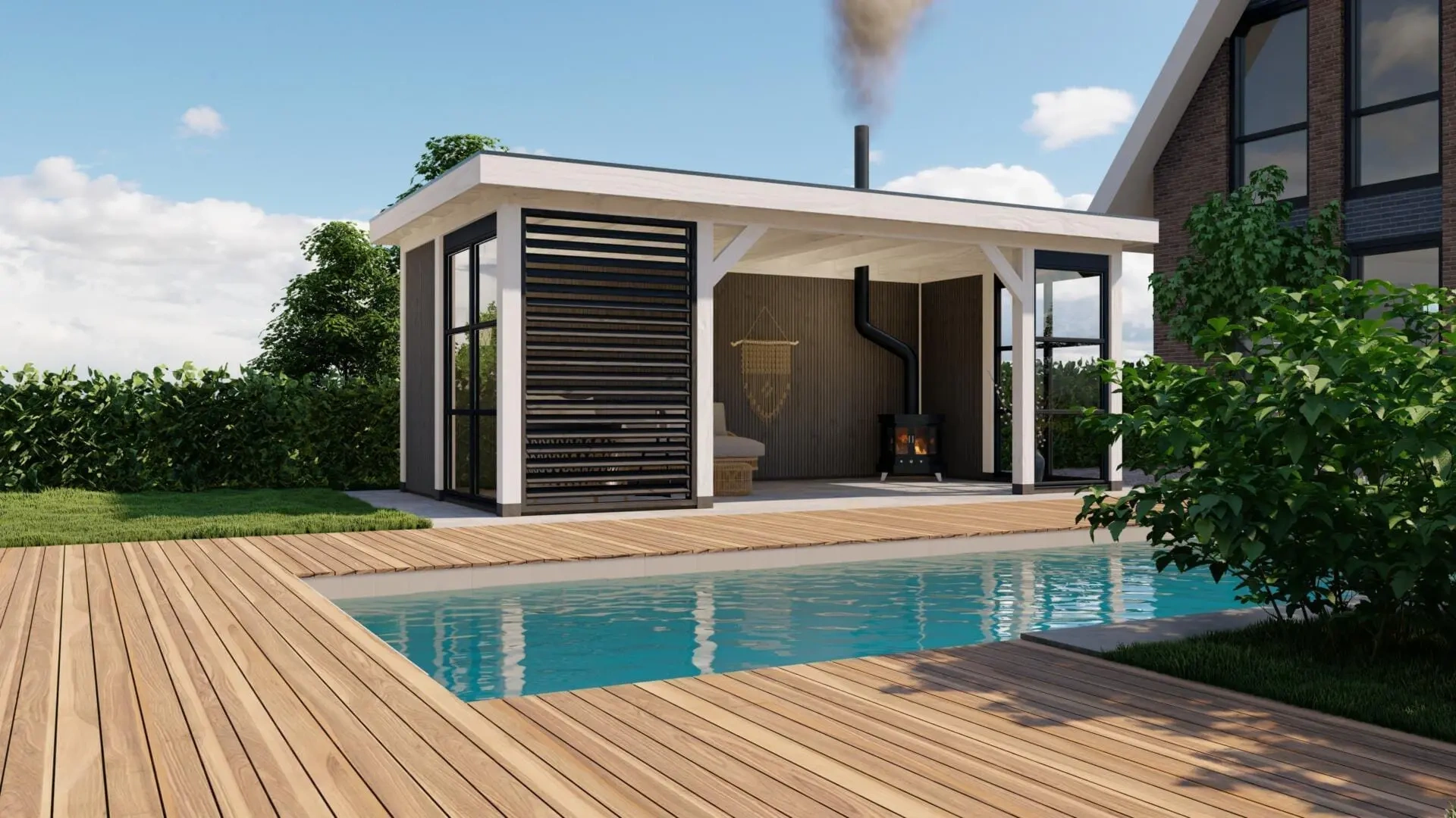 Deze overkapping is dubbelzijdig bekleed met grijze Deens rabat planken en voorzien van stijlvolle shutters.