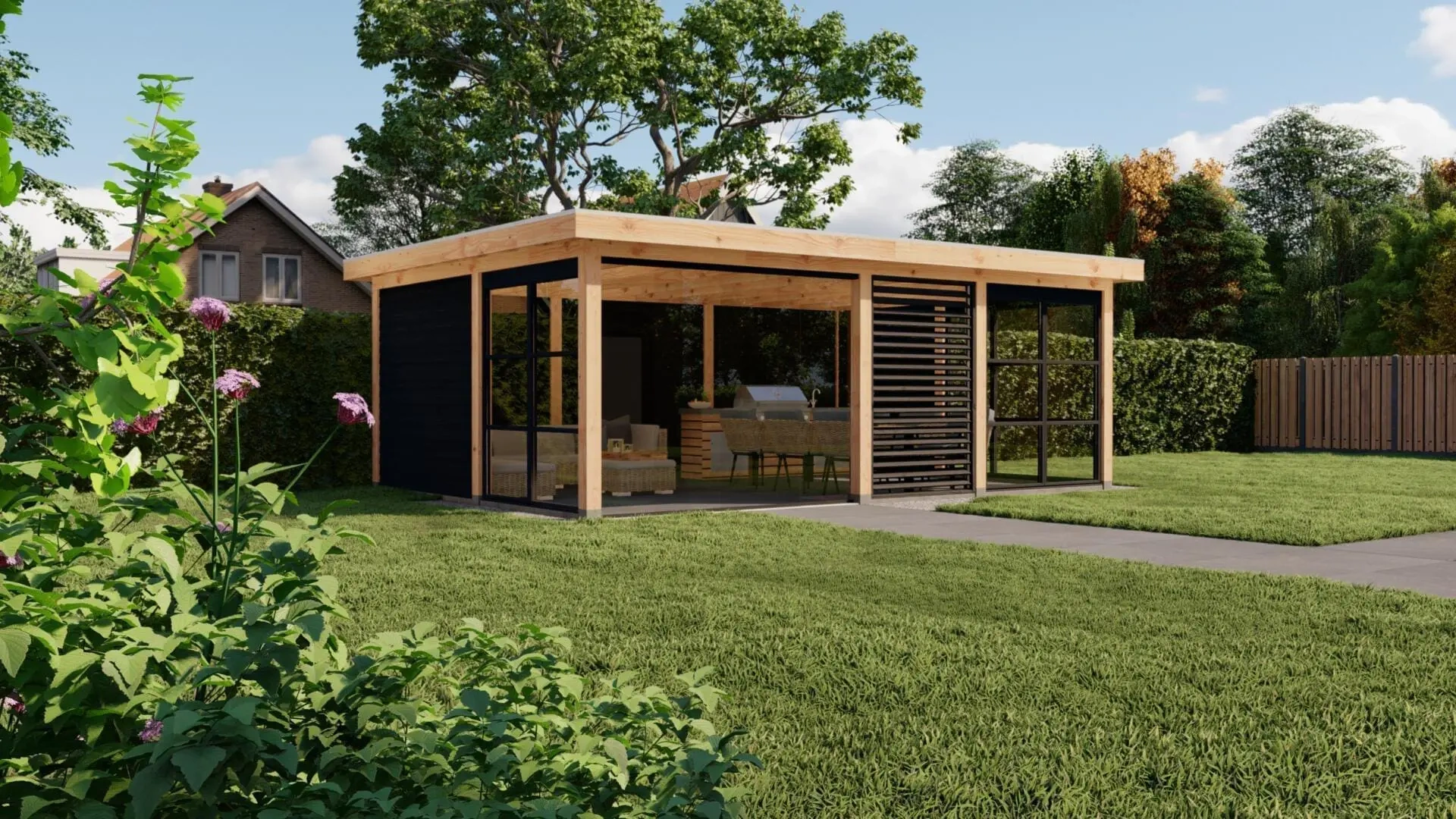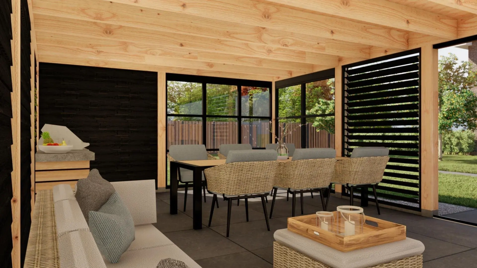 Deze variant het het buitenverblijf Rome is onbehandeld en dubbelzijdig bekleed met zwarte potdekselplanken.