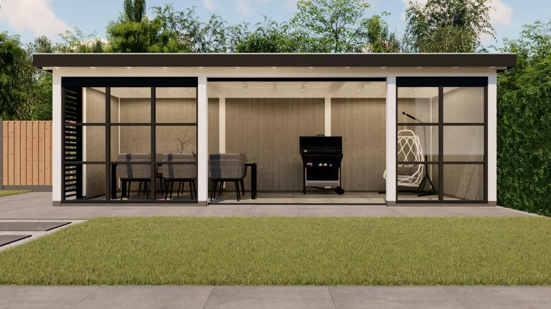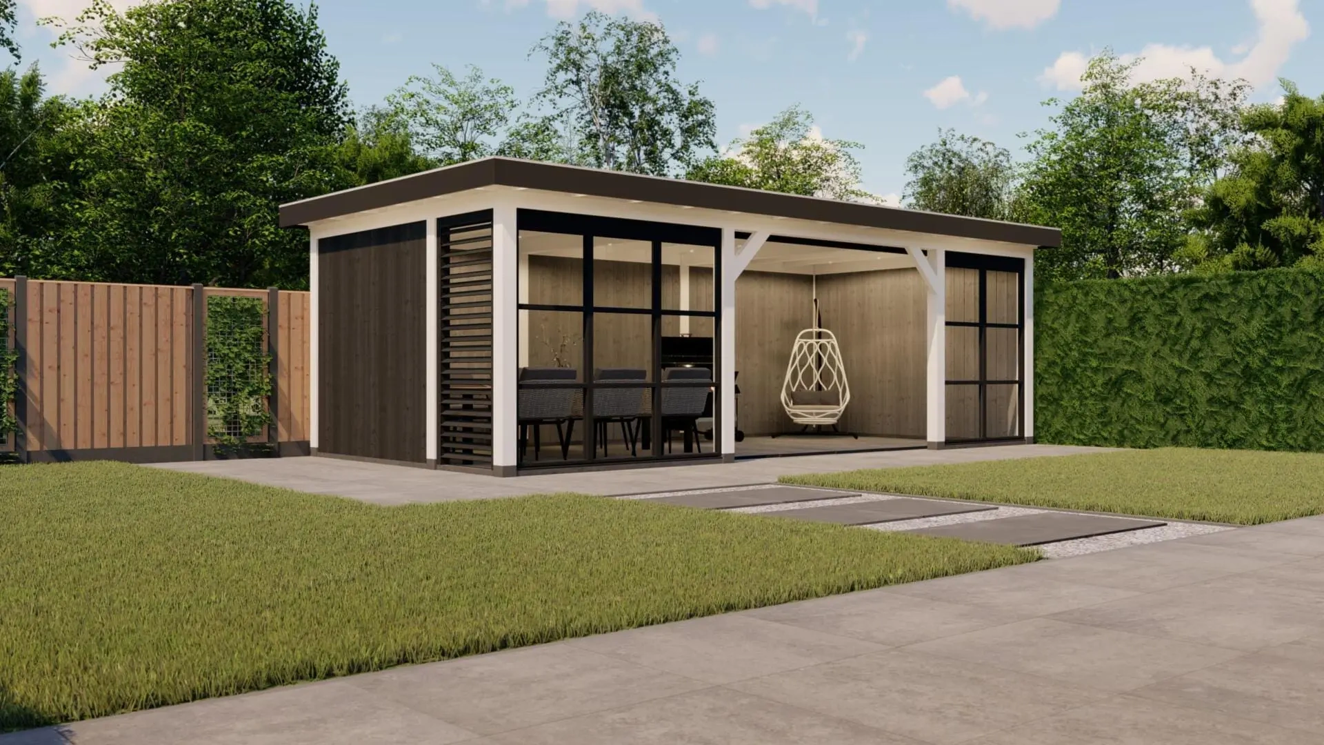 Deze variant van het buitenverblijf Rome is uitgevoerd als sfeervolle tuinkamer en voorzien van steellook glaswanden, een shutter en glazen schuifwand.