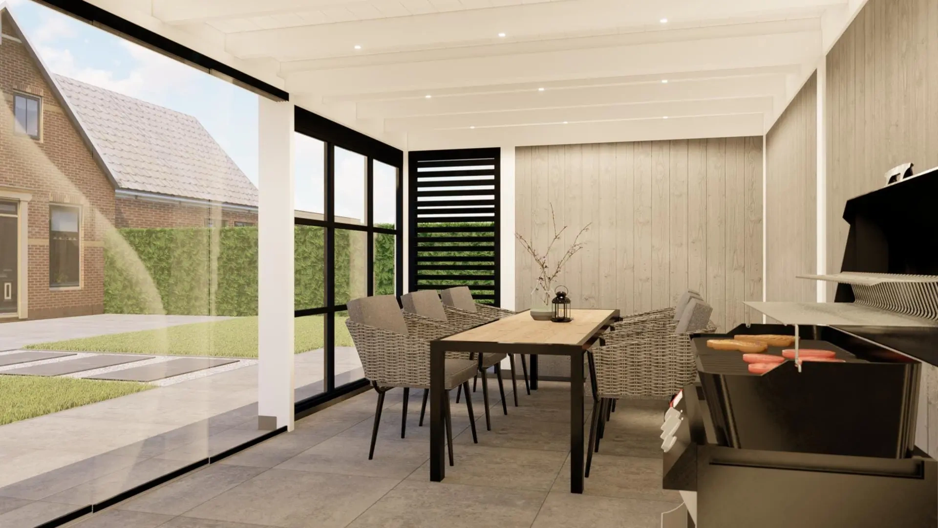 De glazen schuifwanden zorgen voor een mooie onopvallende afsluiting met maximale lichtinval.