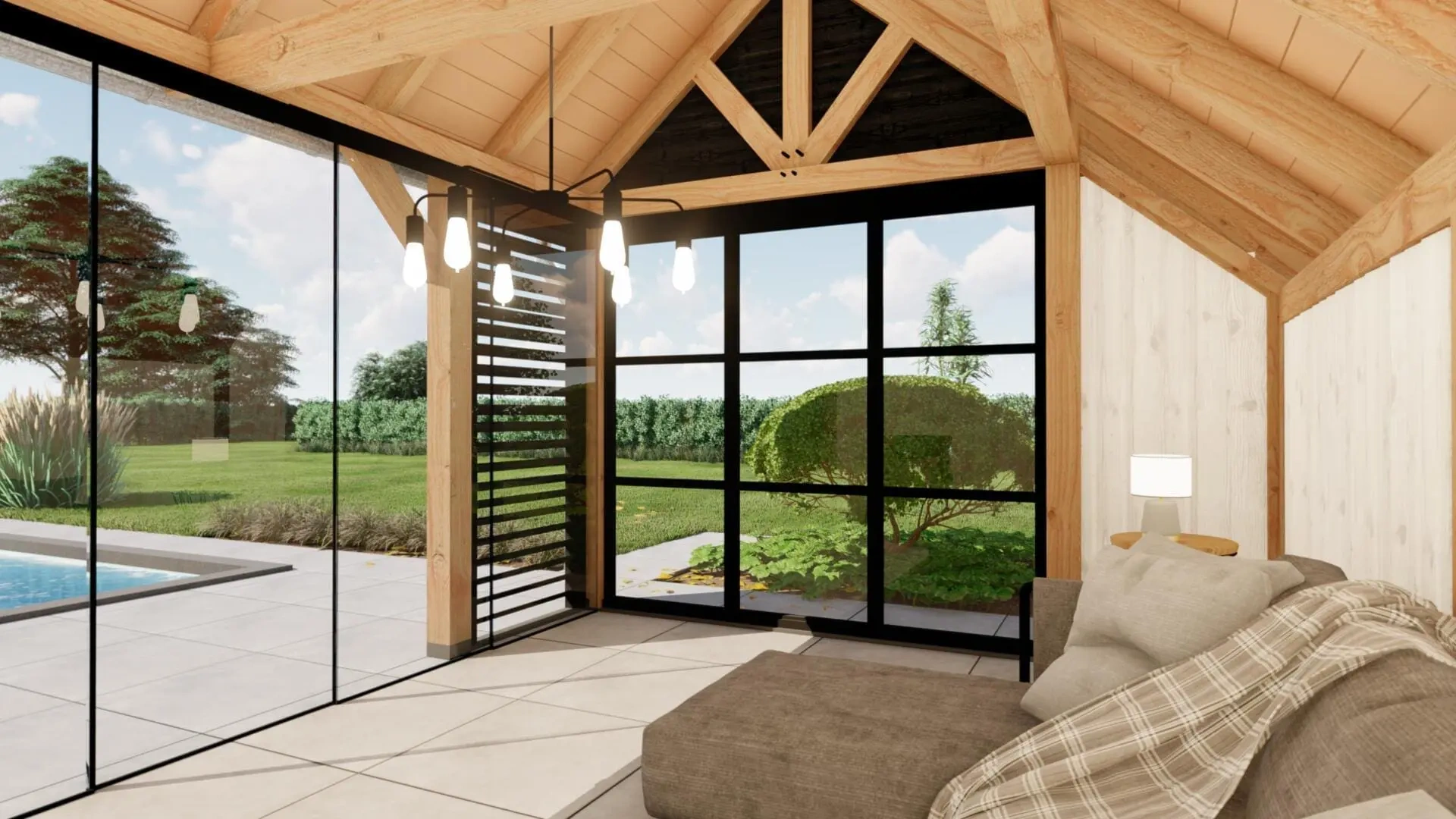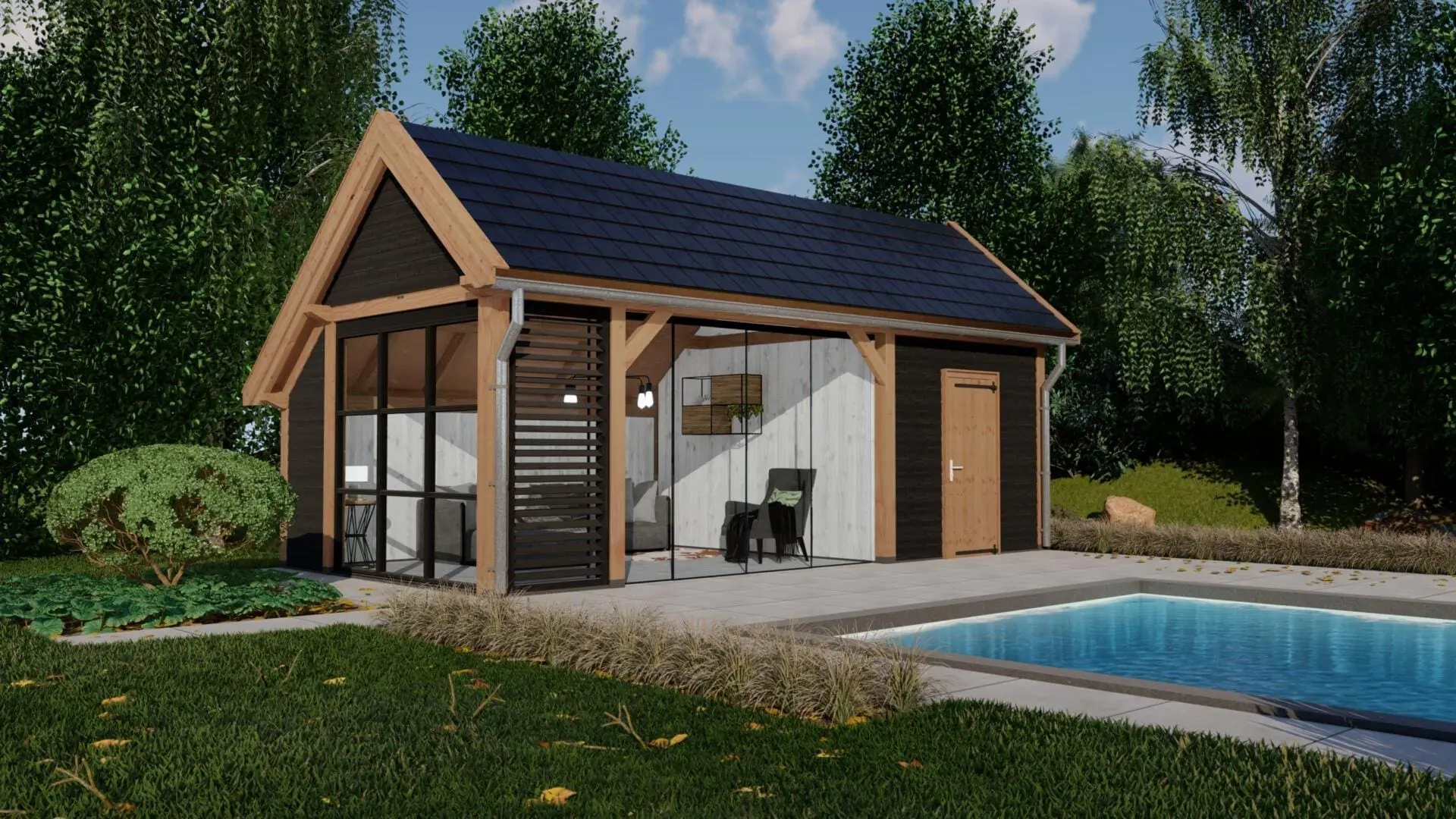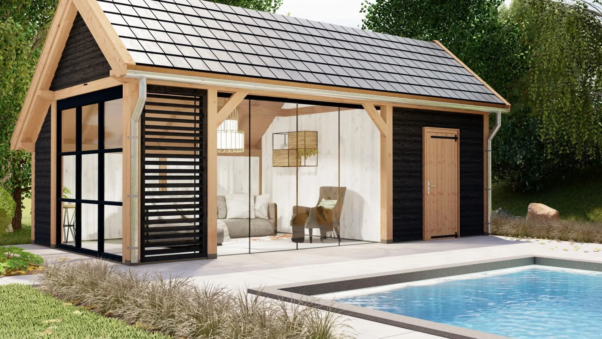 De combinatie met een shutterscherm en een steellook glaswand geven deze kapschuur een chique en exclusieve uitstraling.
