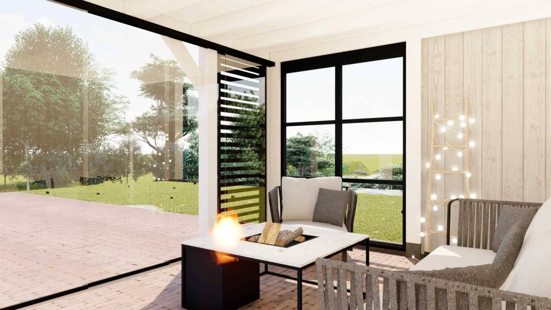 Een glazen schuifwand zorgt voor een onopvallende afsluiting met maximale lichtinval en sluiten de tuinkamer tocht en waterdicht af.