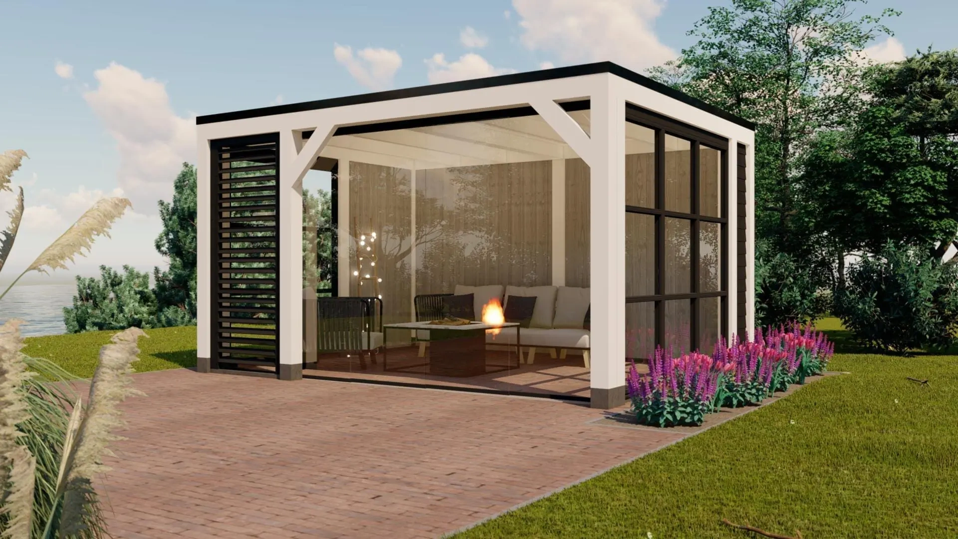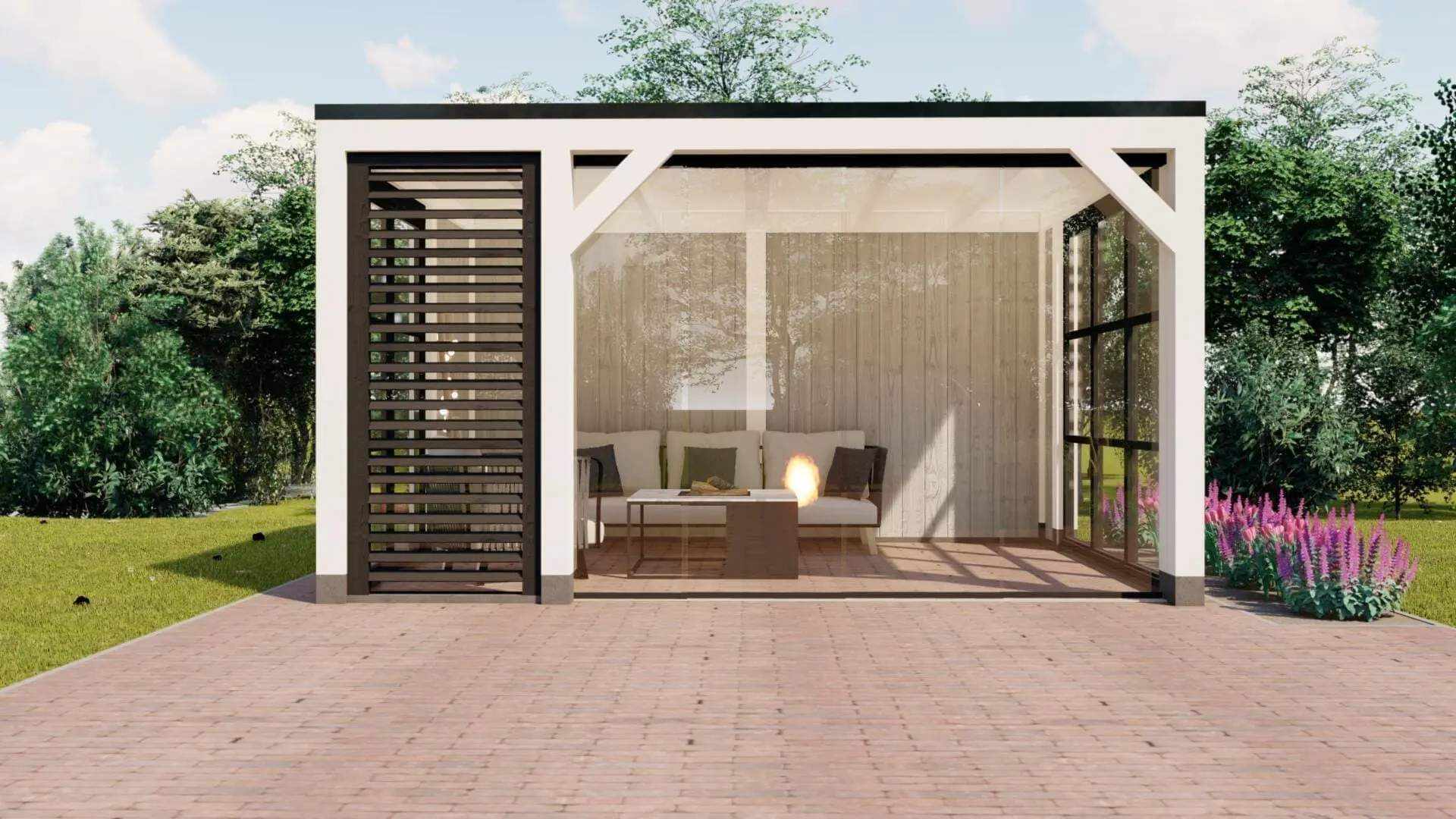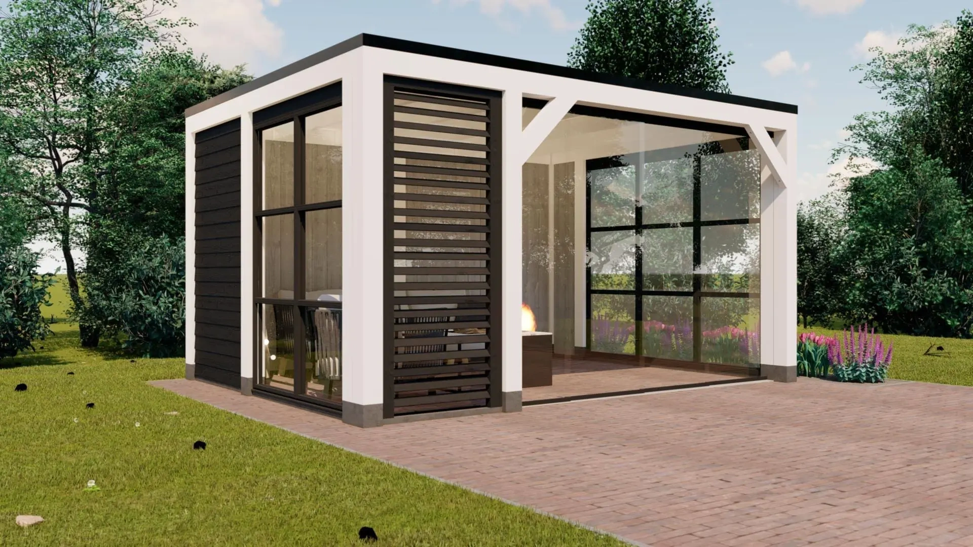 De combinatie met steellook glaswanden in de zijwanden en een shutter in de voorzijde geven het buitenverblijf een chique en exclusieve uitstraling.