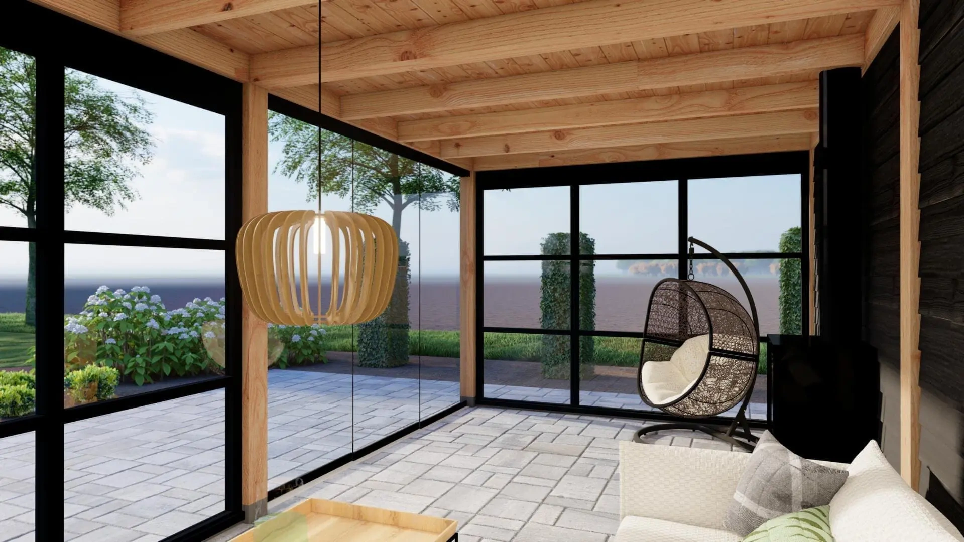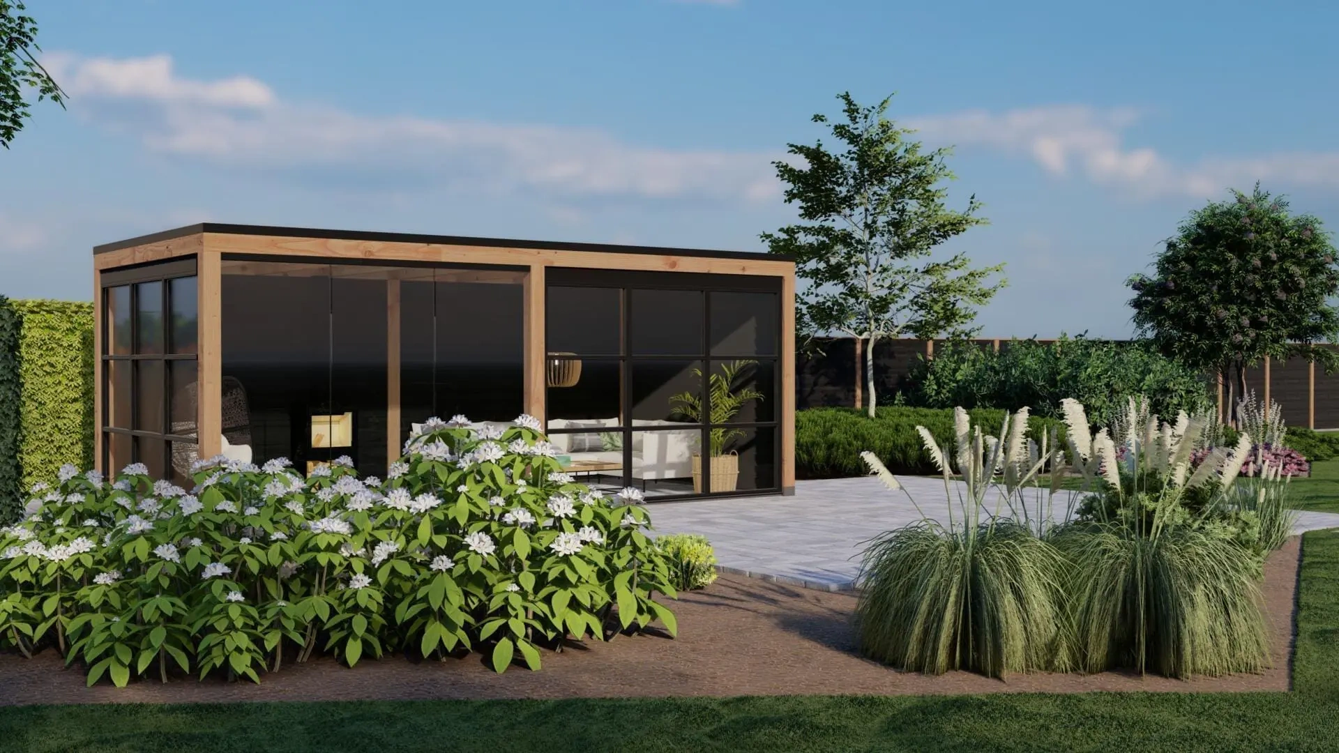 Door dit buitenverblijf uit te voeren met een steellook glaswand en een glazen schuifwand krijgt het geheel een chique en exclusieve uitstraling.
