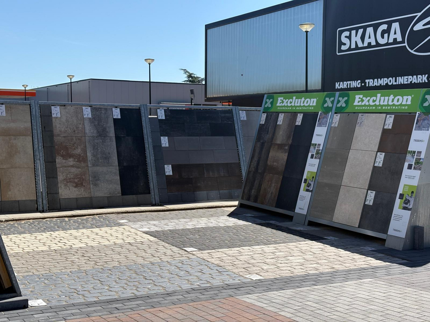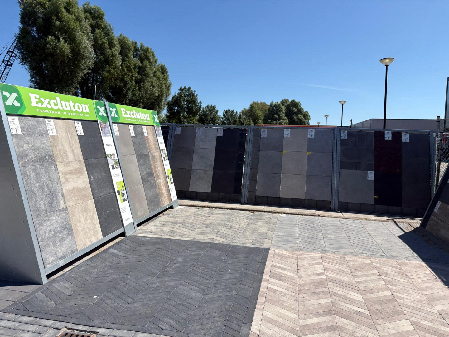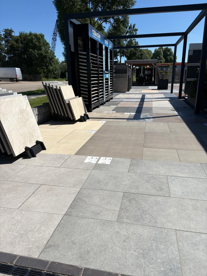 Groot assortiment keramische tegels, hout en sierbestrating