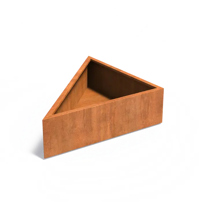 Een nieuwe vorm, gekenmerkt door dezelfde hoeken als die van een geodriehoek. Onze TRIANGLE van cortenstaal heeft een warme uitstraling en is ook prachtig te combineren met andere cortenstaal elementen in de tuin. Voor als je net even iets anders wil!