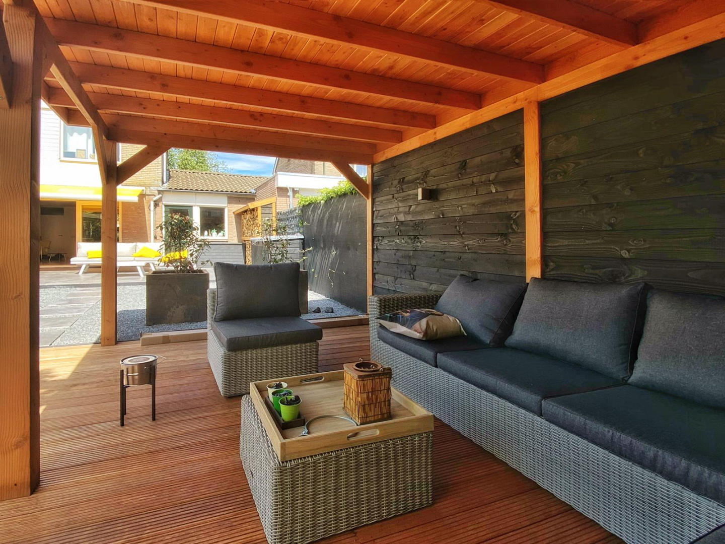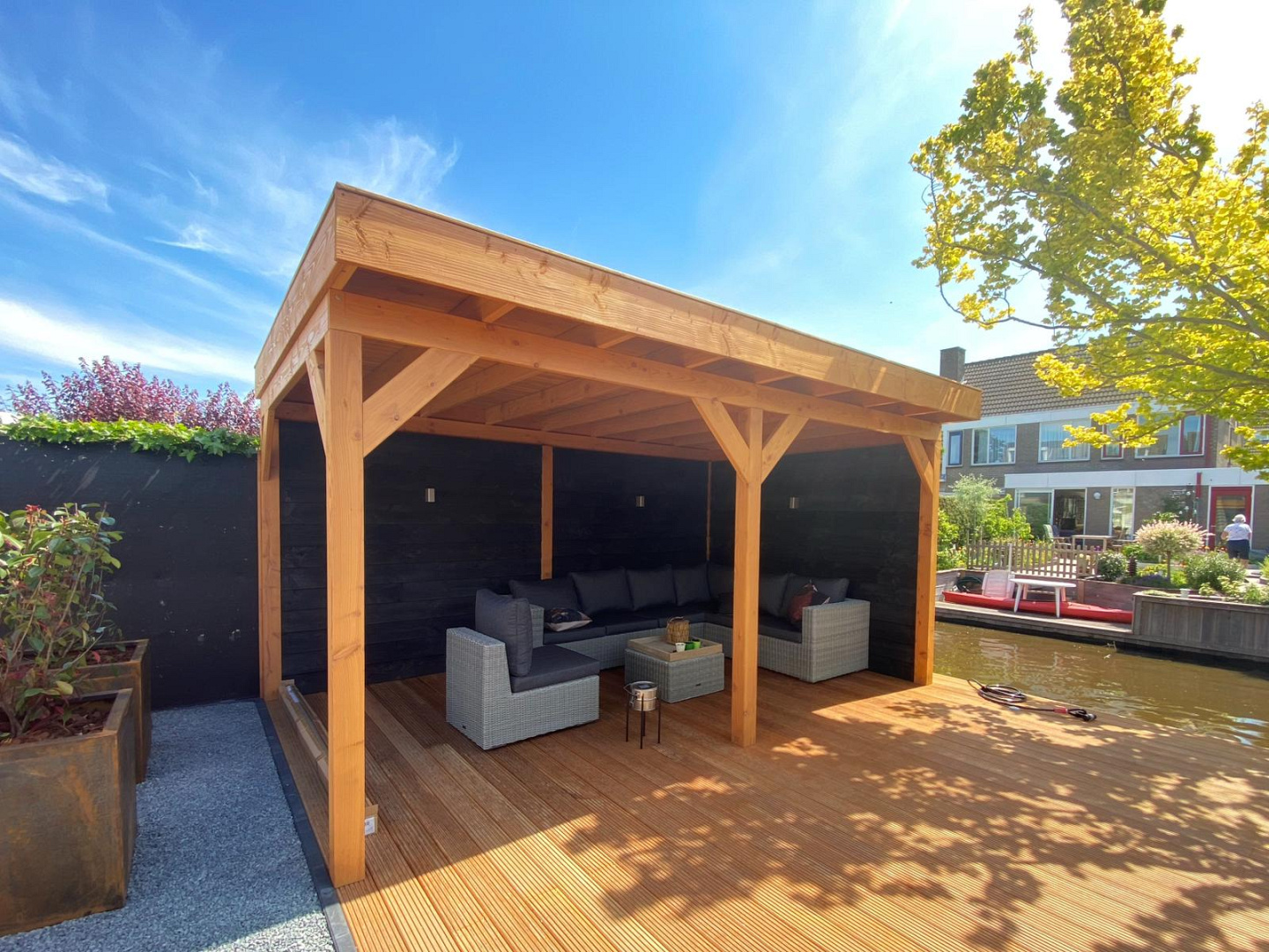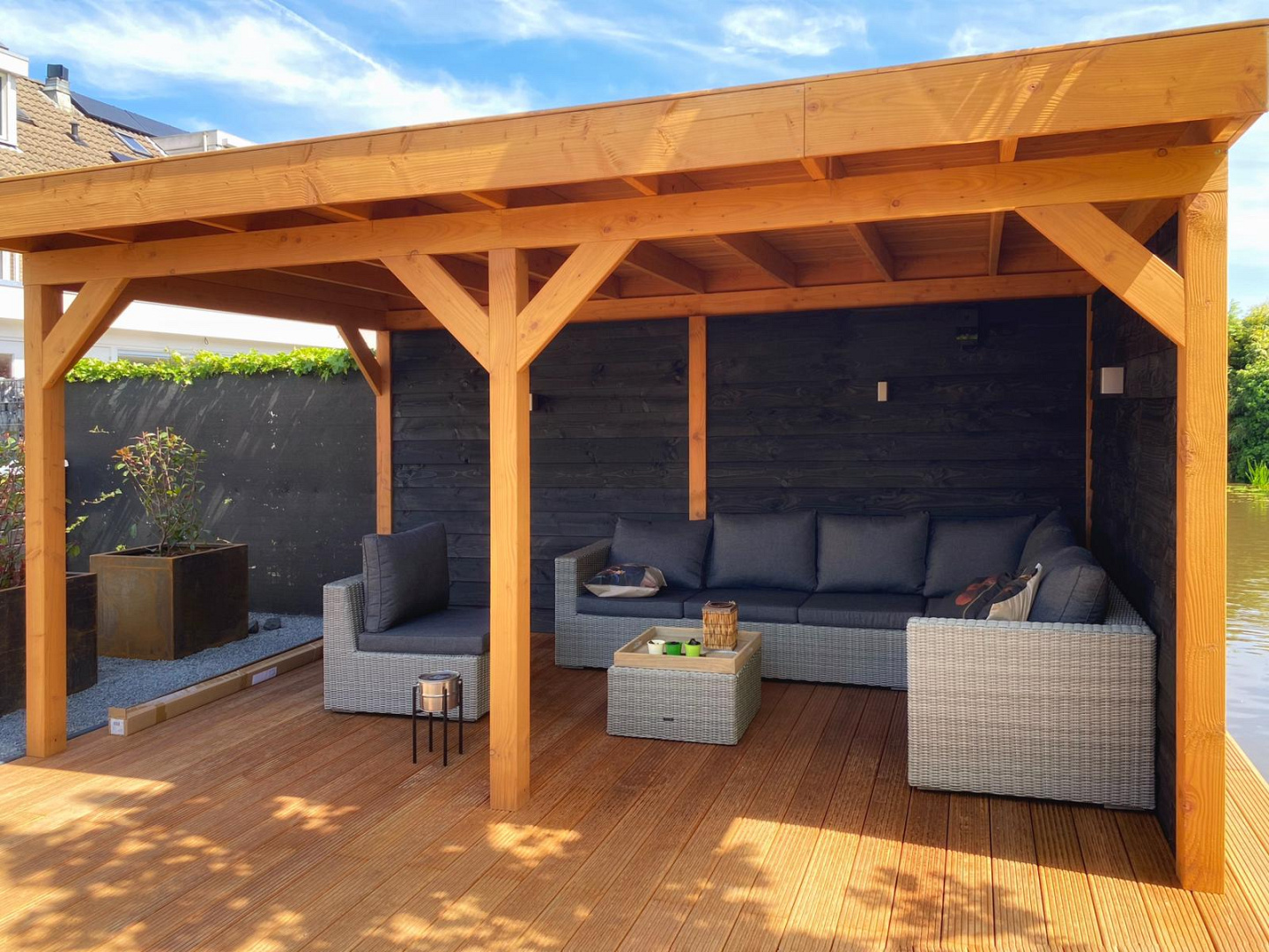 De robuuste houtconstructie straalt kwaliteit en vakmanschap uit en sluit perfect aan bij de strakke lijnen van het tuinontwerp. Dankzij de open structuur en doordachte plaatsing blijft het contact met de tuin behouden, terwijl je toch uit de wind en regen zit.