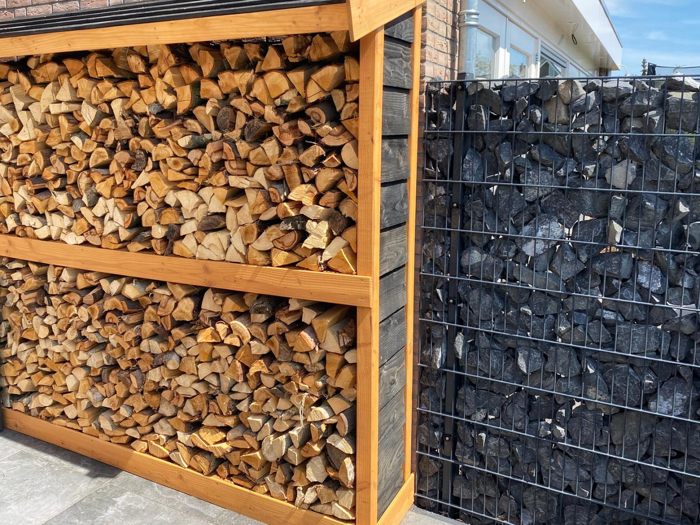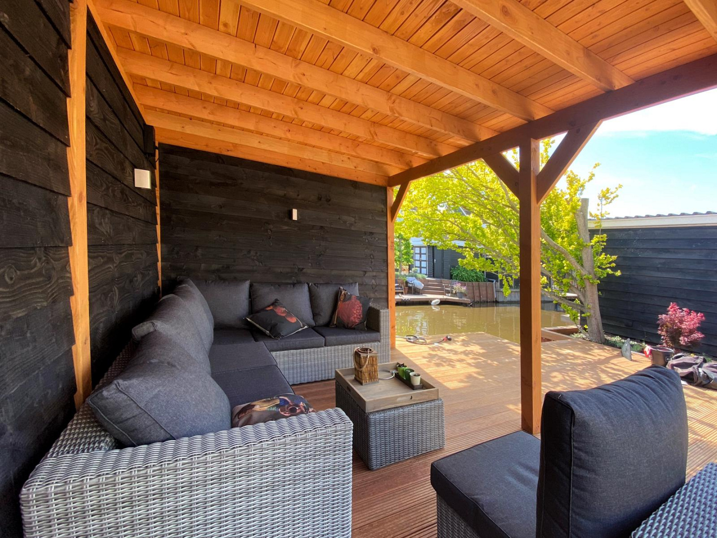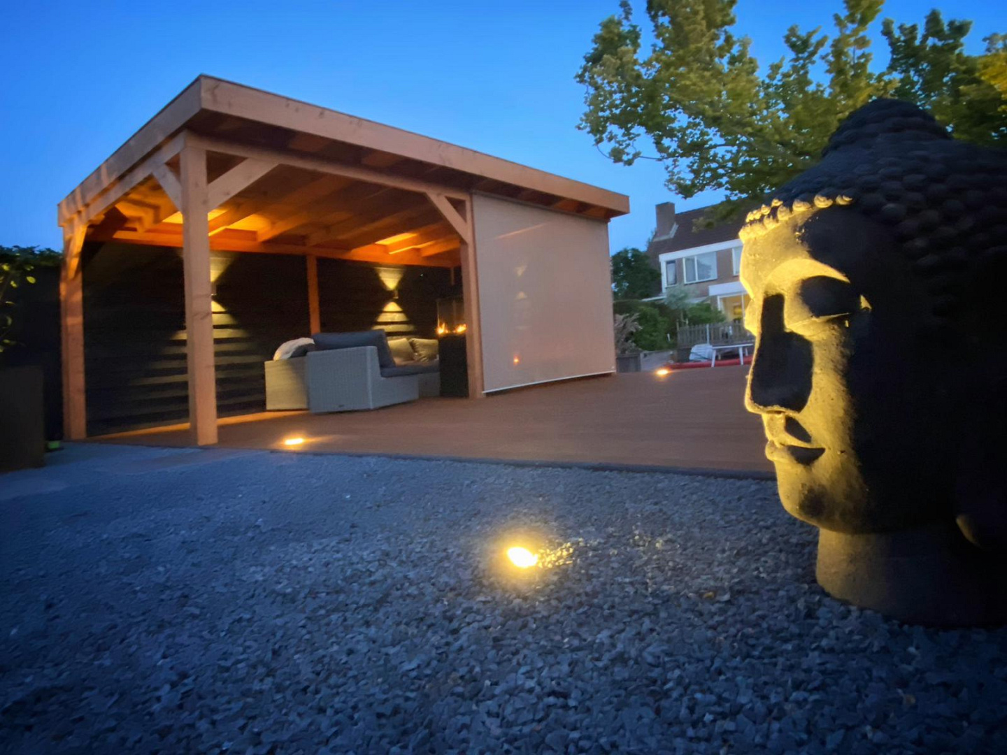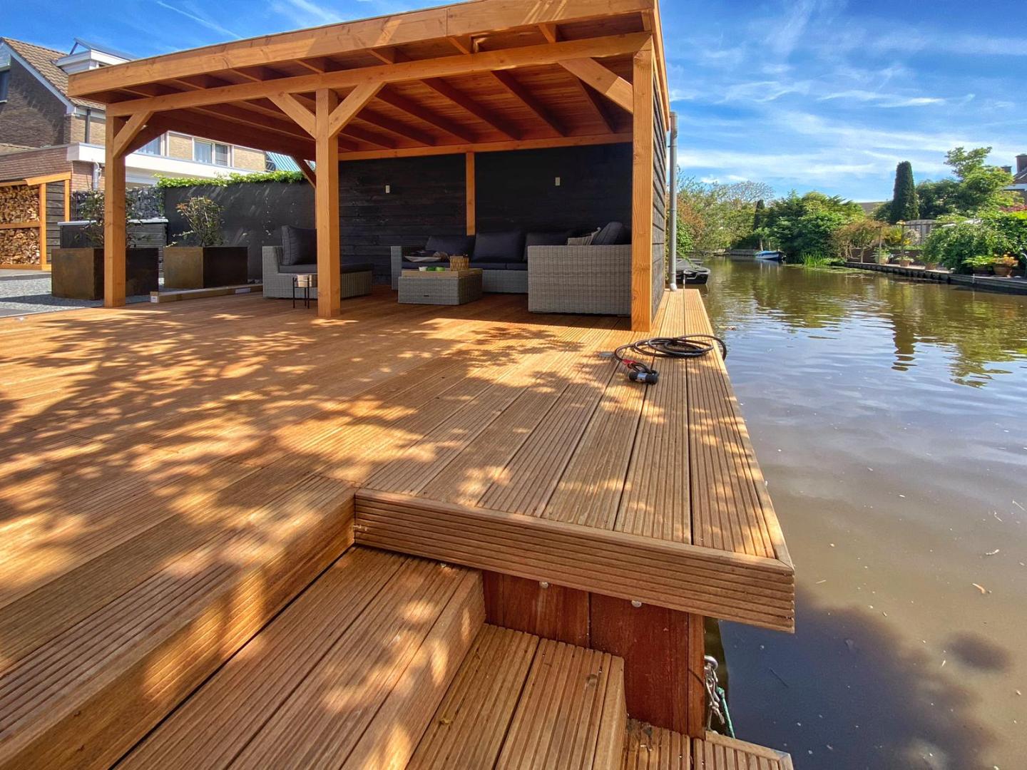 De robuuste houtconstructie straalt kwaliteit en vakmanschap uit en sluit perfect aan bij de strakke lijnen van het tuinontwerp. Dankzij de open structuur en doordachte plaatsing blijft het contact met de tuin behouden, terwijl je toch uit de wind en regen zit.