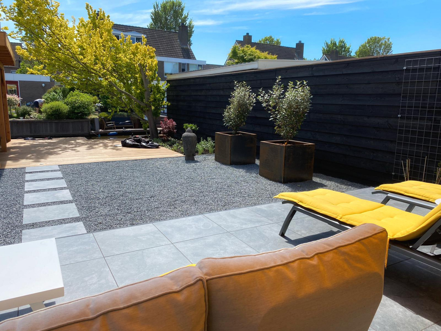 Dankzij de moderne kleurtonen sluit het terras naadloos aan op de rest van het tuinontwerp. Het geheel oogt rustig, modern en vormt een perfecte basis voor zowel beplanting, bomen als houten elementen.