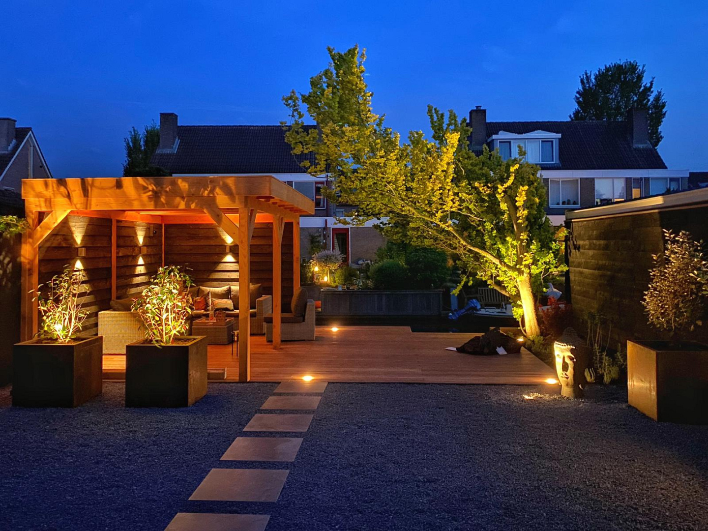 De verlichting benadrukt niet alleen de architectuur en beplanting, maar verlengt ook het gebruiksmoment van de tuin tot in de late uurtjes.