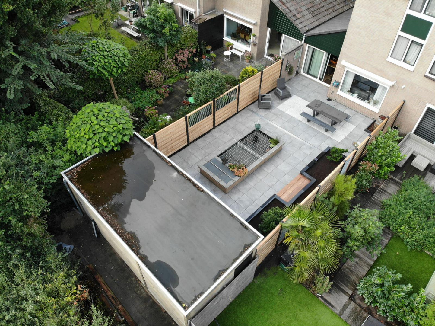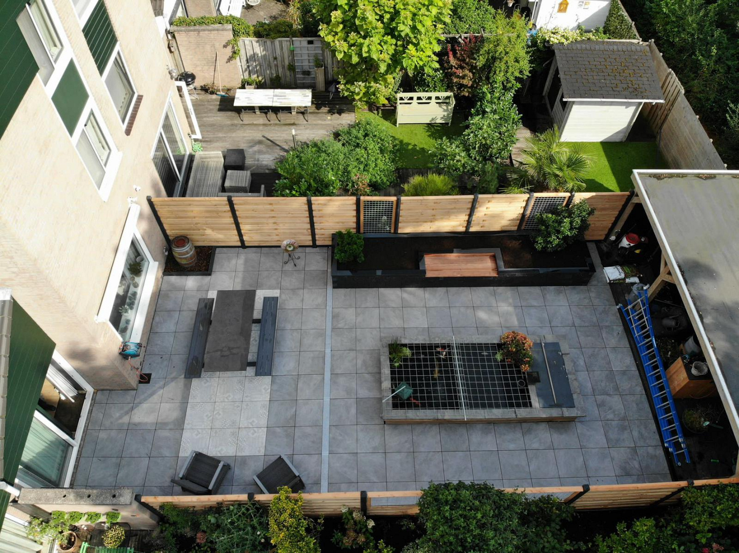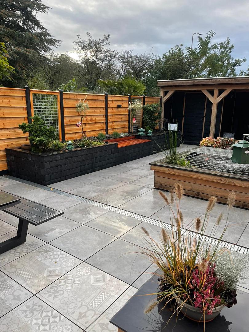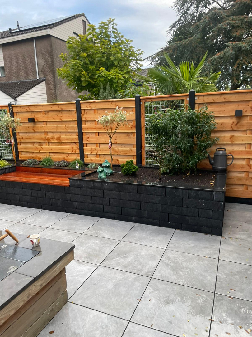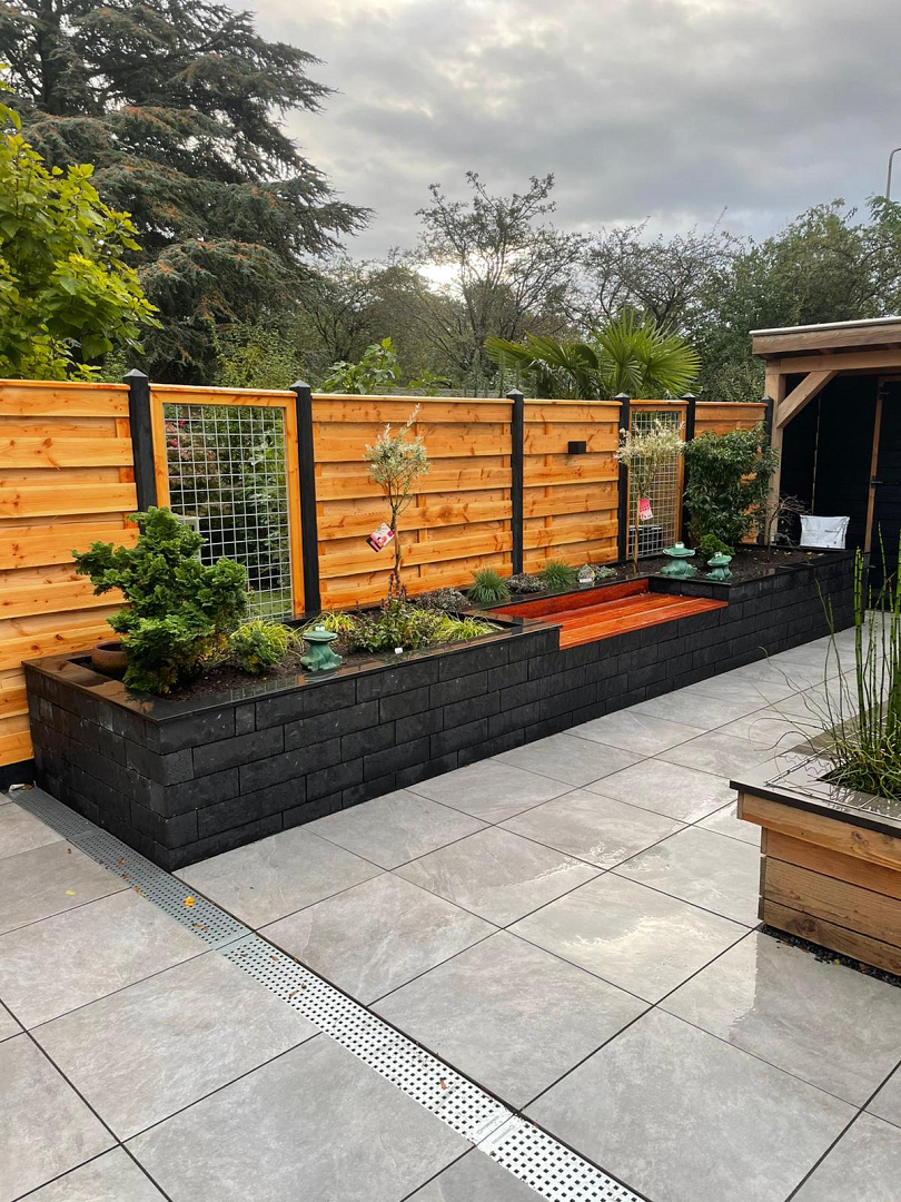 Langs de zijkant van het perceel is een Hout Beton Schutting geplaatst met grenen horizontale tuinschermen, wat optisch bijdraagt aan de lengte van de tuin. Voor een goede regenwaterafvoer zijn watergoten aangelegd, zodat het terras ook bij zware regenval droog en veilig blijft. Achter in de tuin is een buitenverblijf gerealiseerd, dat dient als beschutte loungeplek en mooi aansluit bij de rest van het ontwerp. Hiermee is deze tuin niet alleen visueel in balans, maar ook praktisch en duurzaam ingericht.
