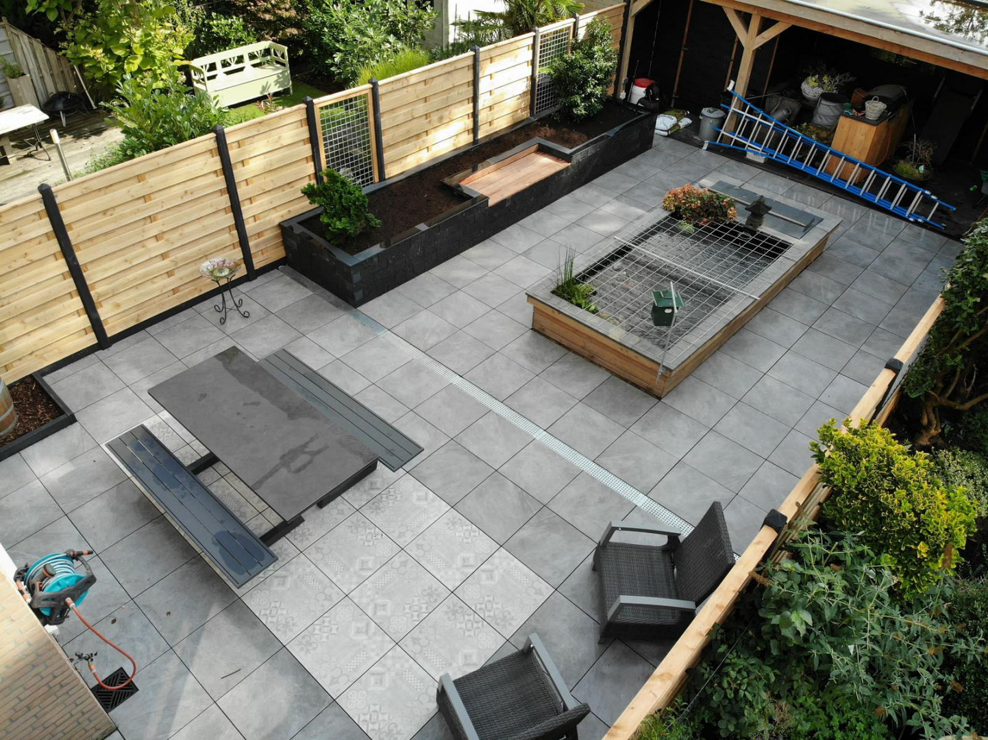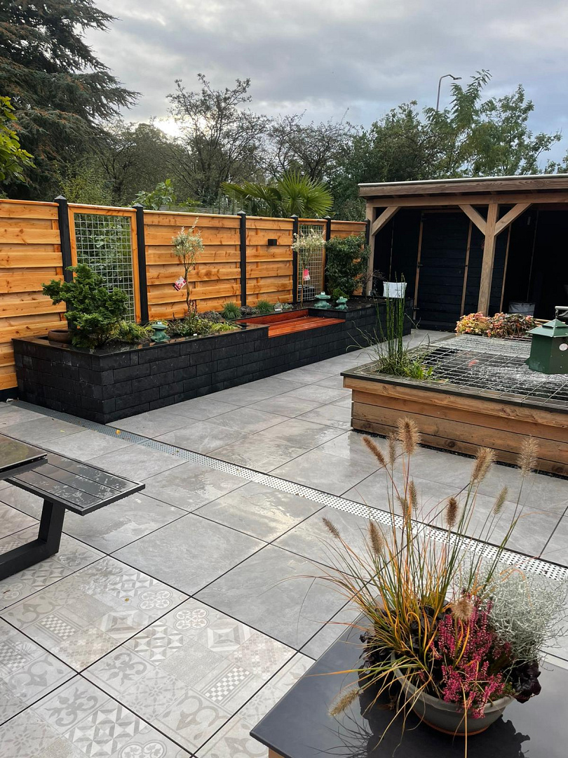 In deze tuin is gekozen voor een strak terras met keramische tegels Slate Design Grey 60x60x4 cm, gecombineerd met mozaïektegels van het type Mosaic Grey. Deze mix zorgt voor een rustig basispalet met subtiele details, waardoor het terras een stijlvolle en tijdloze uitstraling krijgt. De combinatie van tegels met fijne mozaïekstructuren voegt speelsheid toe aan het ontwerp en creëert een elegant geheel.