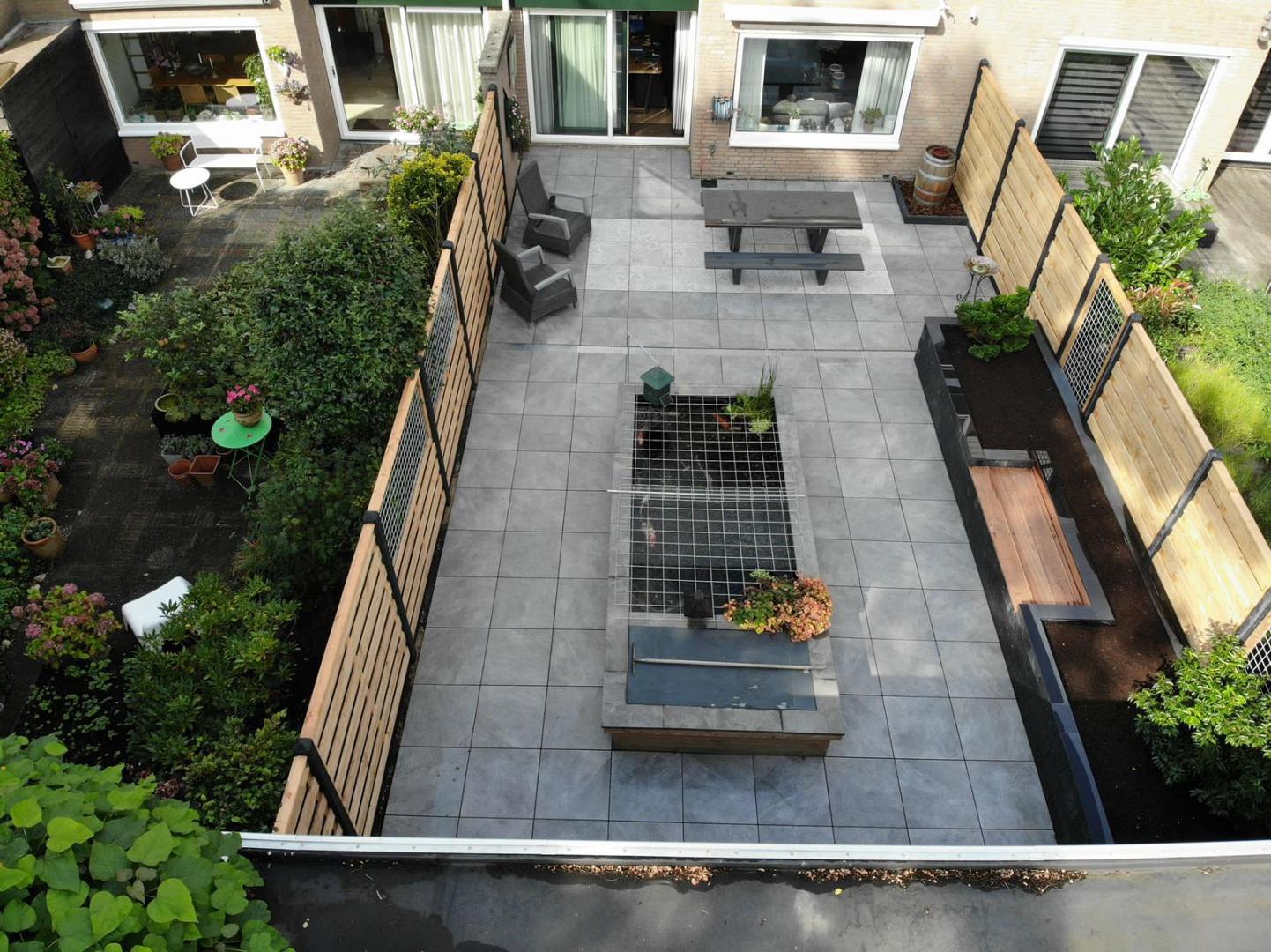 De borders zijn opgebouwd met Riven Walling Antra, dat zijn antracietkleurige stapelblokken. De 3 verschillende lengteformaten zorgen voor een robuuste en natuurlijke afwerking. Tussen de borders is een zitbank verwerkt van hardhouten vlonderplanken, wat warmte en comfort toevoegt aan het ontwerp. In het midden van de tuin ligt een vijver vol met koi vissen, afgewerkt met Granero vijverranden. Deze luxe afwerking geeft de vijver een strakke omlijsting en maakt het tot een centraal element in de tuin.