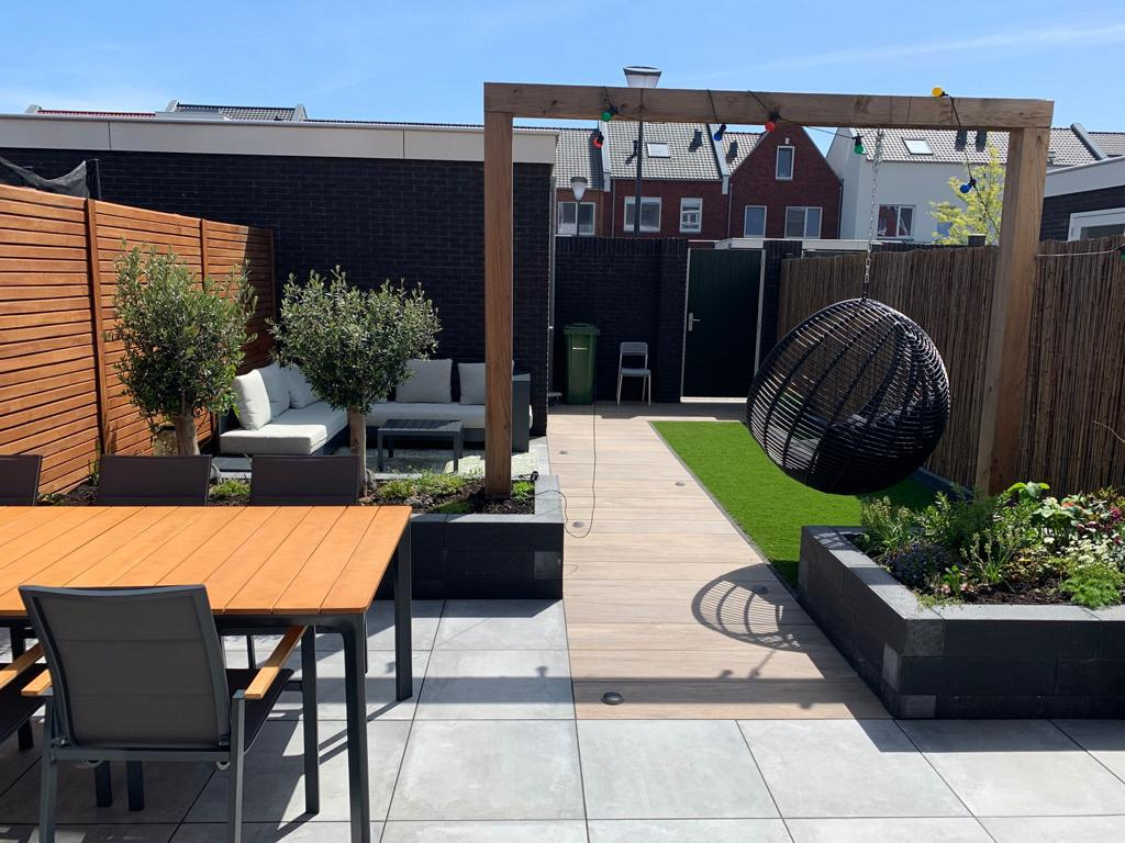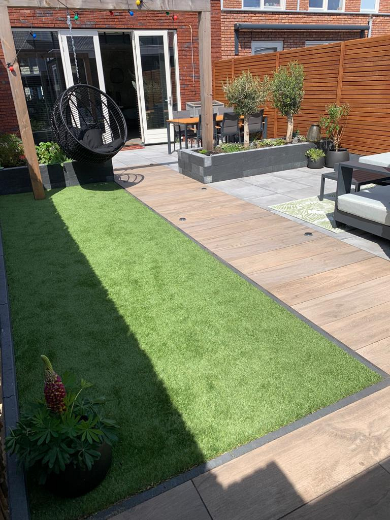 Het gazon is aangelegd met kunstgras van het type Brasil, dat bekendstaat om zijn realistische uitstraling en comfortabele zachtheid. Voor de erfafscheiding is gekozen voor een combinatie van stijlen: aan de linkerzijde een strakke schutting met lattenstijl, en aan de rechterzijde een natuurlijke afscheiding van bamboerollen. Deze mix van materialen geeft de tuin karakter en maakt het ontwerp zowel functioneel als speels.