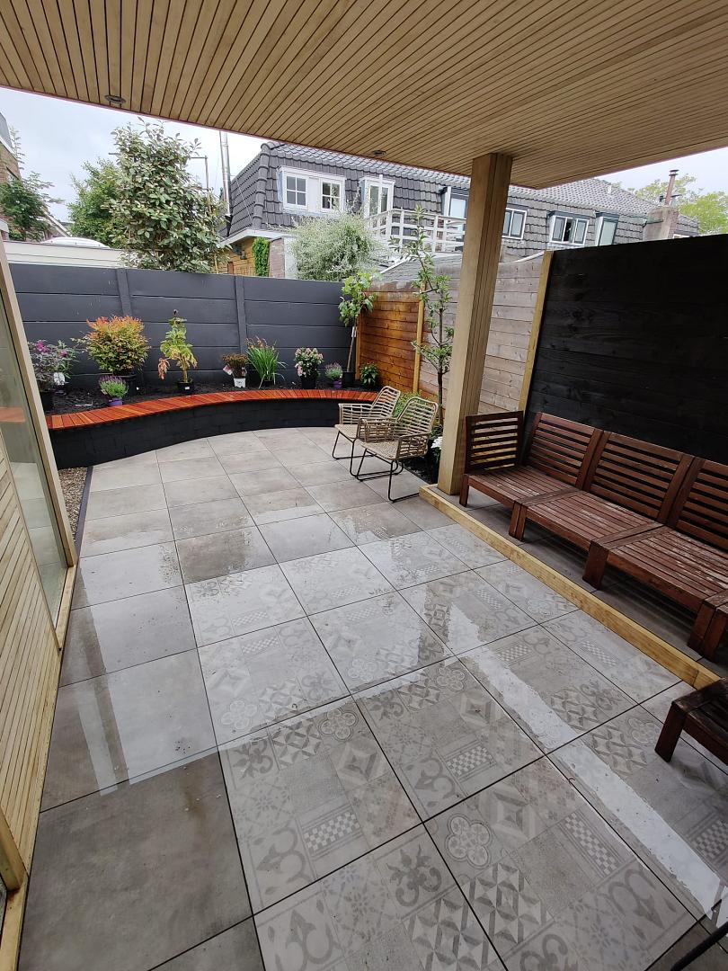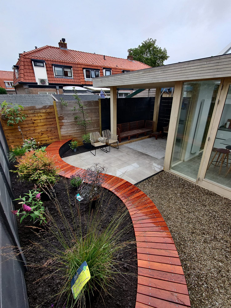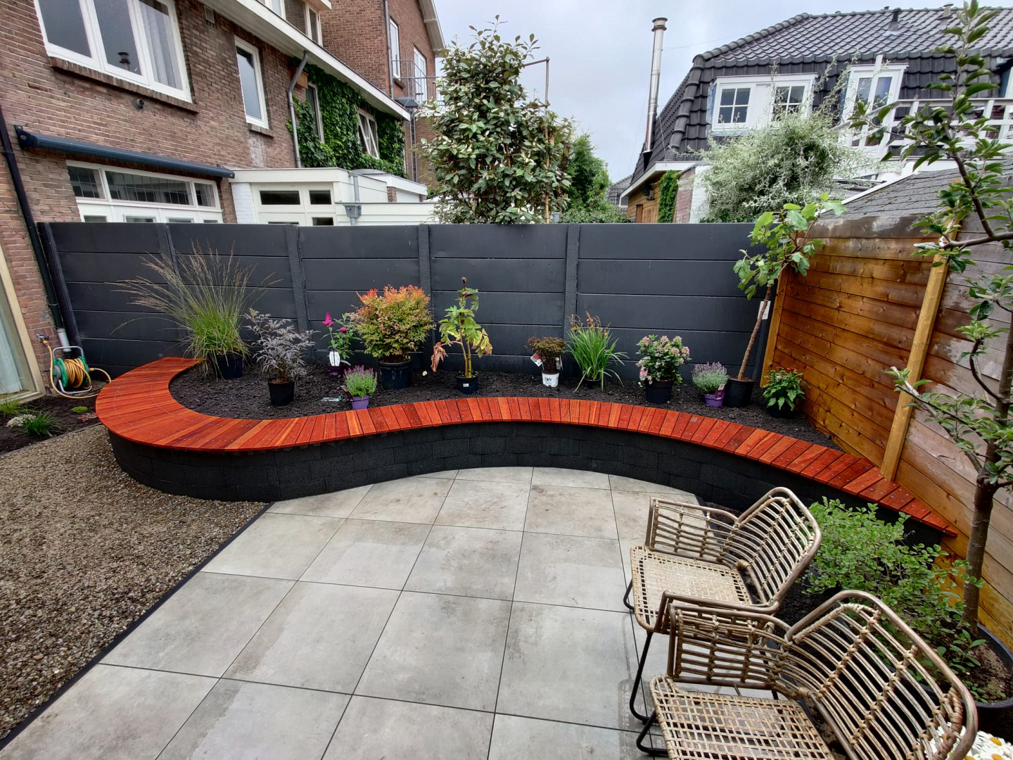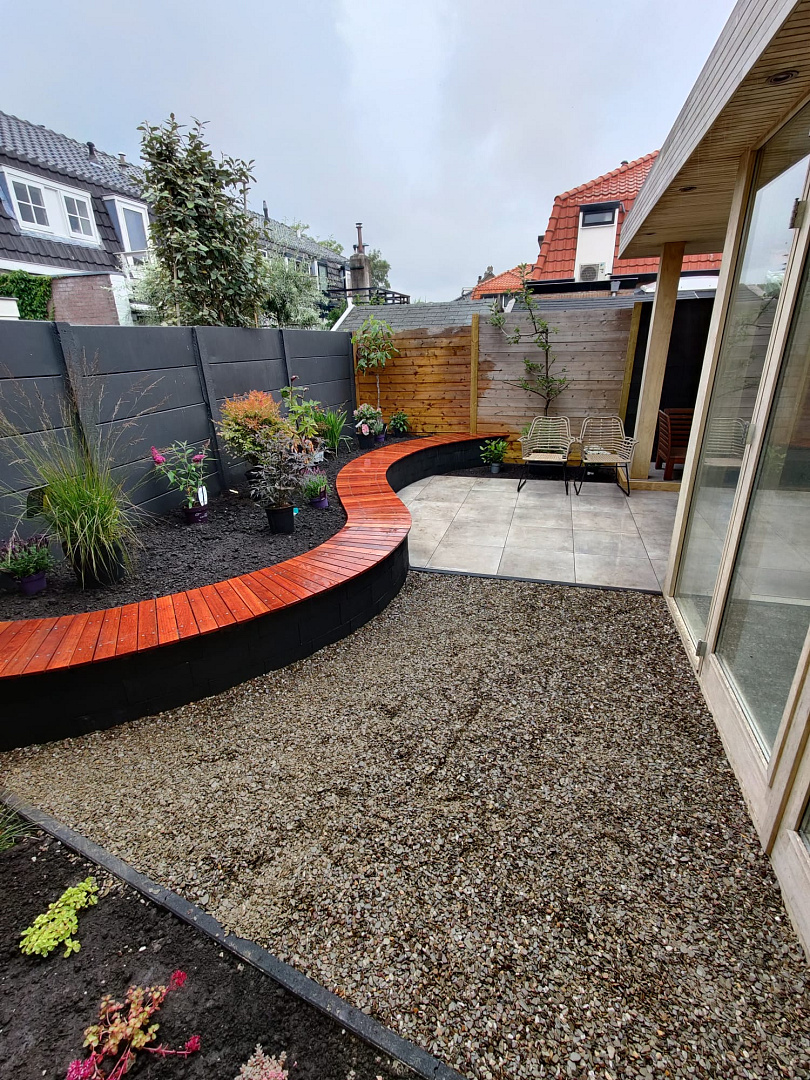 Door de combinatie van strakke keramische tegels, los verwerkte splitvakken en organische vormen in de vorm van een verhoogde border ontstaat een tuin met karakter. De materialen zijn duurzaam en onderhoudsarm, perfect voor jarenlang tuinplezier. Deze doordachte opbouw maakt van de tuin niet alleen een visueel hoogstandje, maar ook een praktische leefruimte waar elke vierkante meter benut wordt.