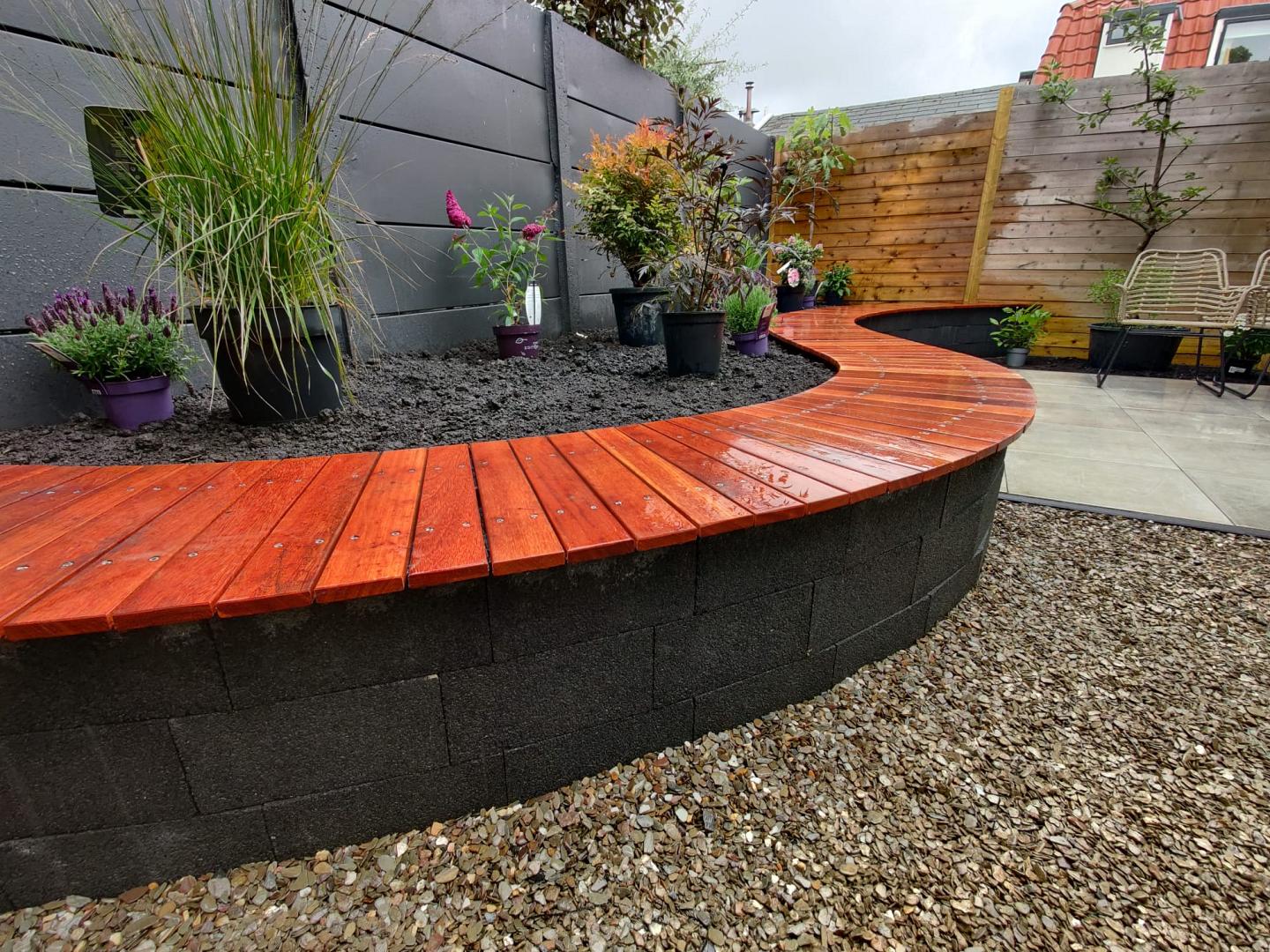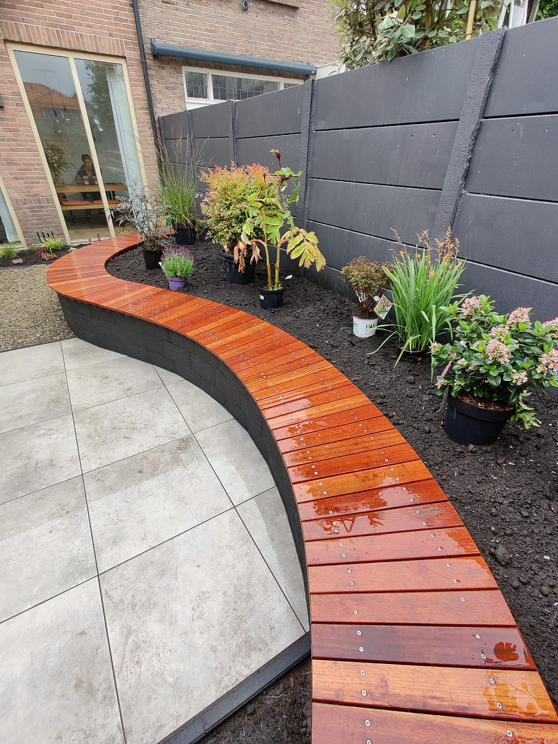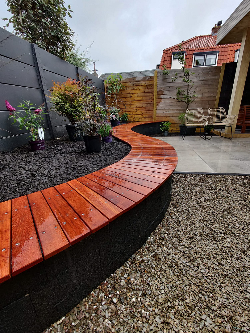 Een echte eyecatcher in deze tuin is de verhoogde border met organische vormen, afgewerkt met hardhouten latten die dienen als comfortabele zitbank. Deze combinatie van groen en functionaliteit nodigt uit tot ontspanning, terwijl de vloeiende lijnen zorgen voor een speelse, natuurlijke balans. De houten accenten brengen warmte in het ontwerp en versterken de sfeer van rust en luxe.