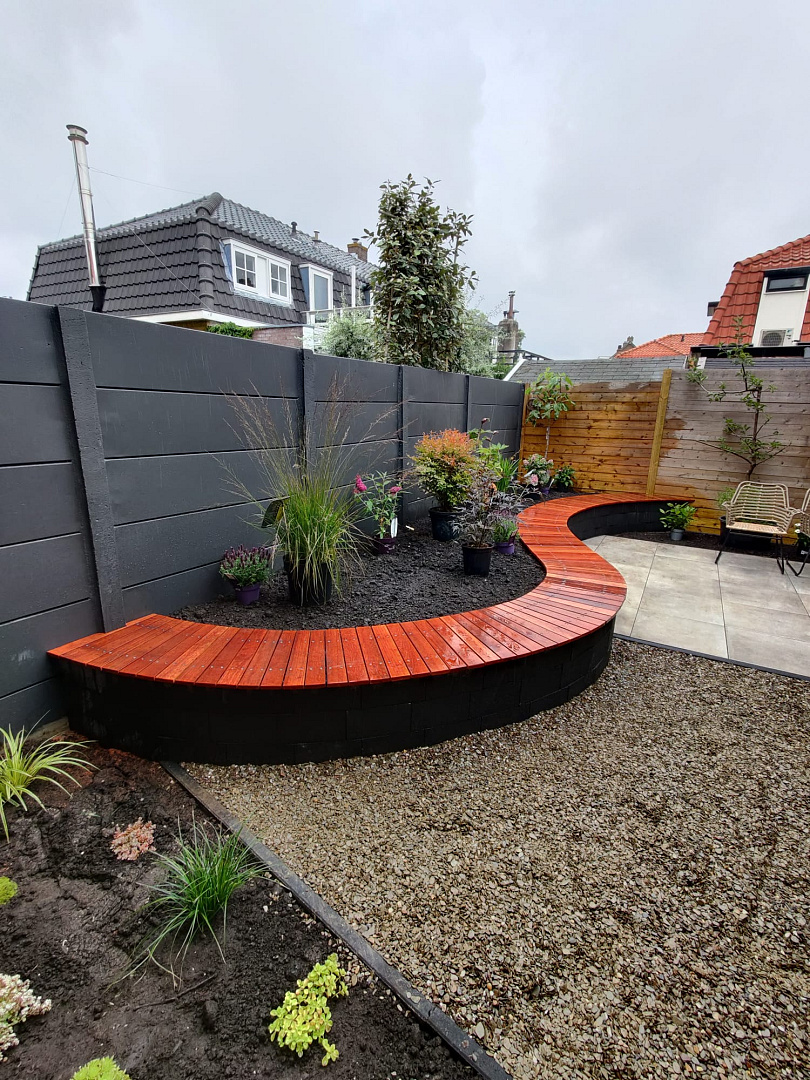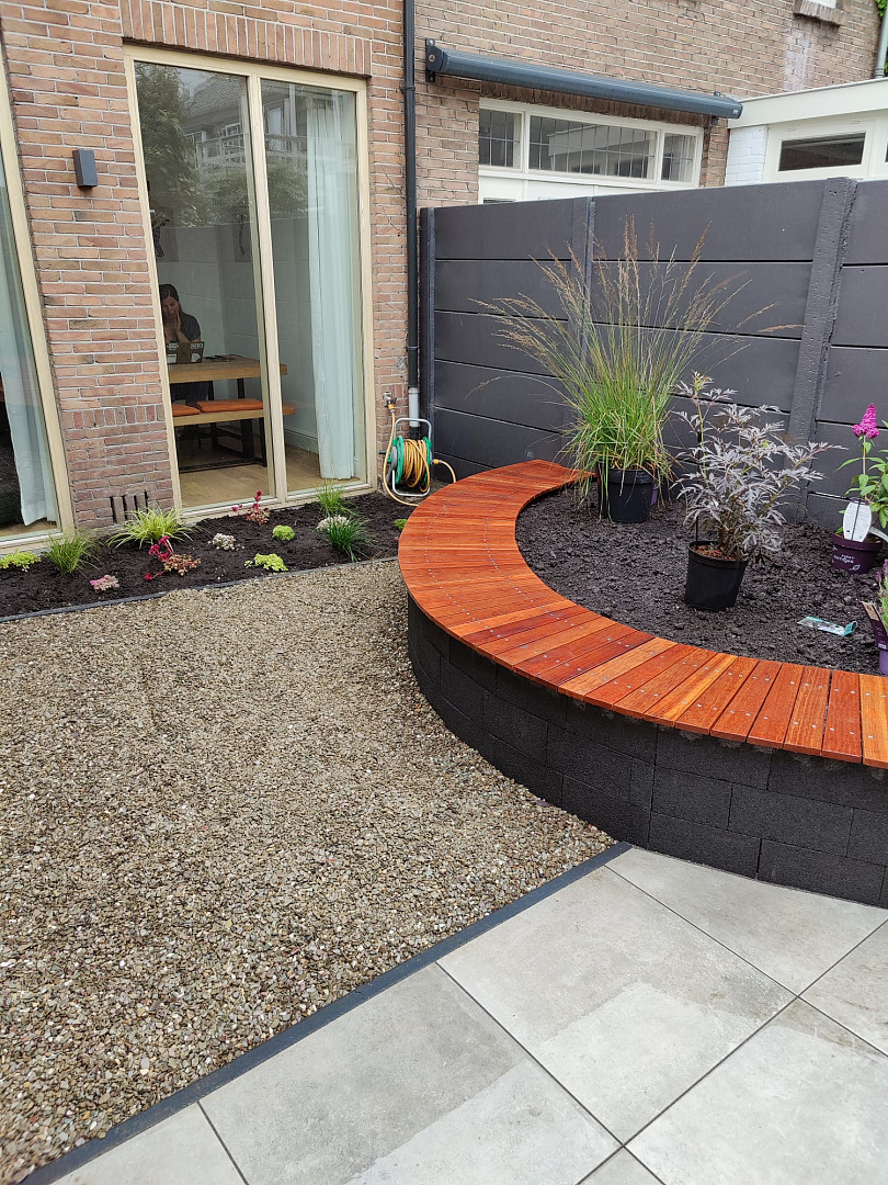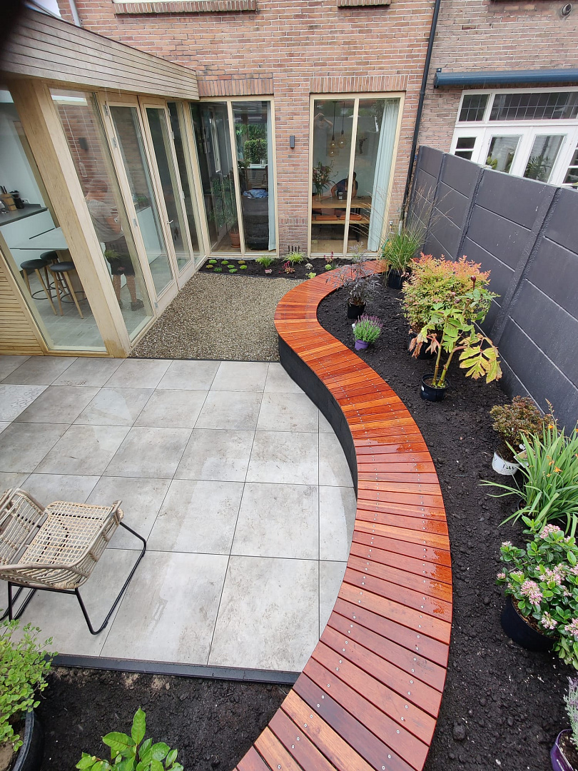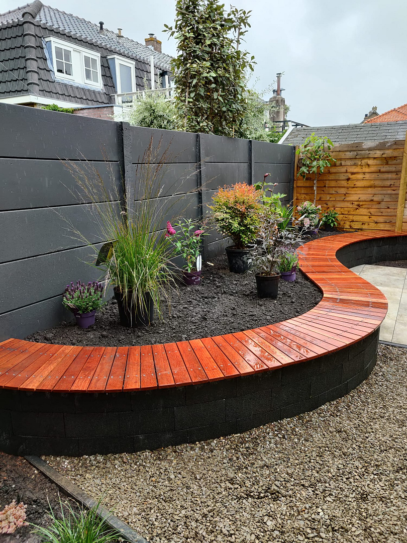 Een echte eyecatcher in deze tuin is de verhoogde border met organische vormen, afgewerkt met hardhouten latten die dienen als comfortabele zitbank. Deze combinatie van groen en functionaliteit nodigt uit tot ontspanning, terwijl de vloeiende lijnen zorgen voor een speelse, natuurlijke balans. De houten accenten brengen warmte in het ontwerp en versterken de sfeer van rust en luxe.