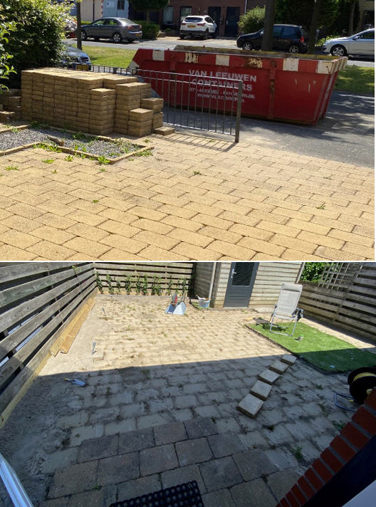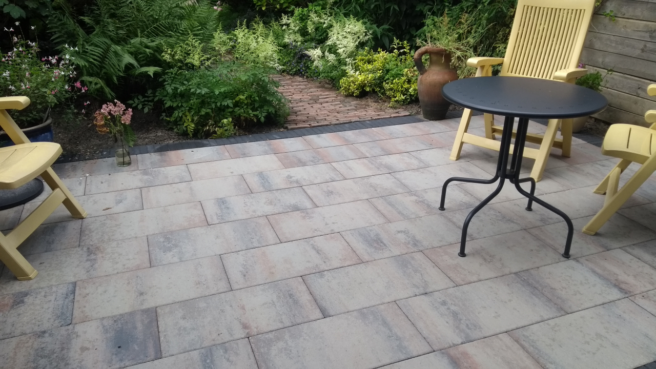 De communicatie tussen Pascal en de stratenmakers was niet optimaal. Zo was afgesproken dat er twee bomen zouden worden verwijderd waar ze niets van afwisten. Na wat heen en weer bellen is dit uiteindelijk toch gedaan. Daarna bleek dat de verkeerde tegels waren geleverd terwijl het oude terras al was verwijderd. Weer bellen en er werd ons medegedeeld dat we weer zes weken moesten wachten. Gelukkig kregen we binnen een week een belletje dat de juiste tegels er toch waren en kon het werk worden afgemaakt. Over het werk hebben we niets te klagen. Vrolijke vakkundige lui en we zijn zeer tevreden met het resultaat.