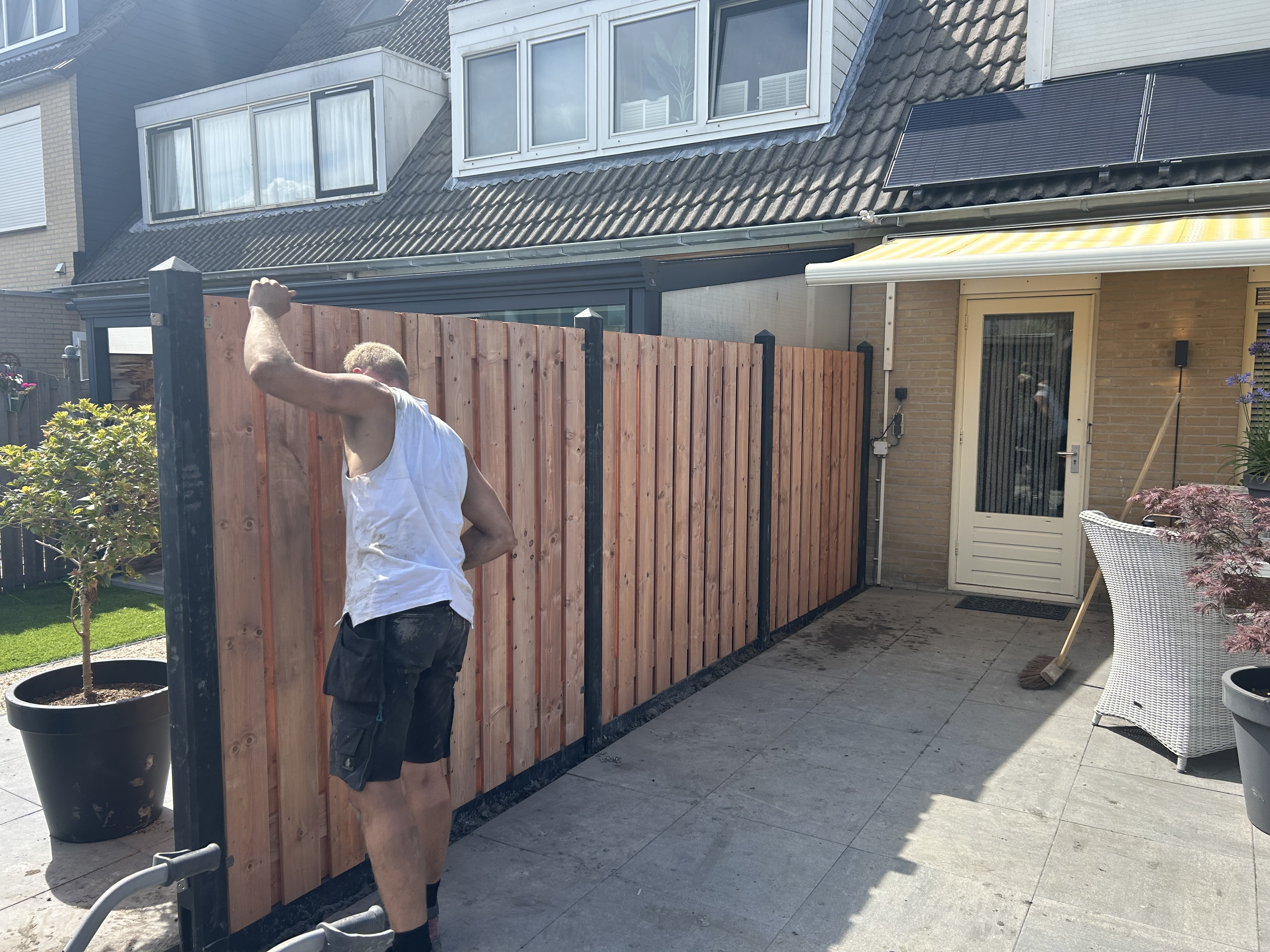 Schrijf een reviewMet de beide buren onze tuin aangepast. Aan de ene kant een mooie nieuwe schutting en aan de andere kant onze gezamenlijke schuur laten bekleden. Het resultaat is helemaal naar wens. Tijdens het proces waren er wat puntjes waar tegen aangelopen werd. Er werd goed meegedacht, gecommuniceerd en opgelost. Super blij en we genieten iedere dag van het resultaat.