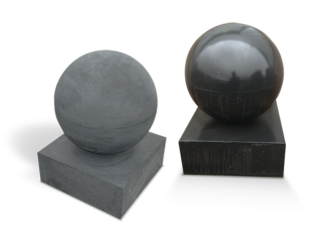 Deze elementen zijn verkrijgbaar in drie verschillende kleuren, grijs, zwart en zwart gecoat. De betonnen bollen hebben een doorsnede van 40 cm met voet 40x40x20 cm en 50 cm met voet 50x50x20 cm.