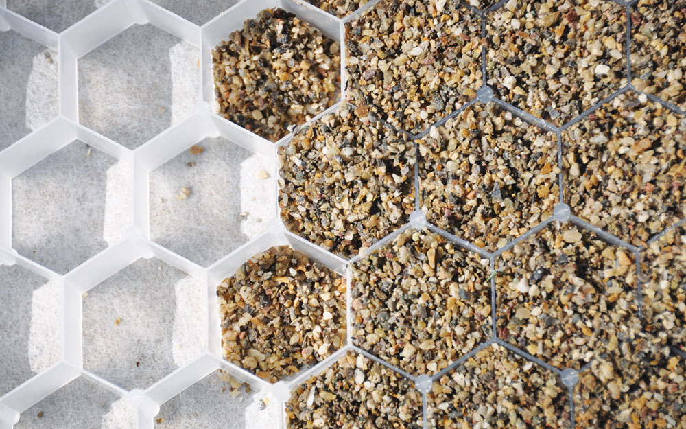 Met stabilisatieplaten blijft grind, split en gras perfect op zijn plek op een tuinpad, oprit of zelfs terras. Hierdoor ontstaat een veilige basis voor tuinmeubels en wordt spoorvorming op de oprit of parkeerplek voorkomen. Het oppervlak blijft voldoende waterdoorlatend waardoor het regenwater goed weg kan zakken in de bodem. De stabiele ondergrond is zelfs met de fiets of rolstoel eenvoudig te berijden. Zonder de grindplaat is dit ondenkbaar. Het honingraatrooster van deze grindplaat is voorzien van een waterdoorlatend geotextiel welke onkruidgroei vermindert. Hoe werkt het? Hedendaagse tuinontwerpen kenmerken zich door de diversiteit aan verhardingen. Een gecombineerde aanleg van waterdoorlatende en ondoorlatende verhardingen is niet alleen vanuit esthetisch oogpunt een aanrader, infiltratie is gunstig voor de grondwaterstand en de bodemstructuur van de tuin.