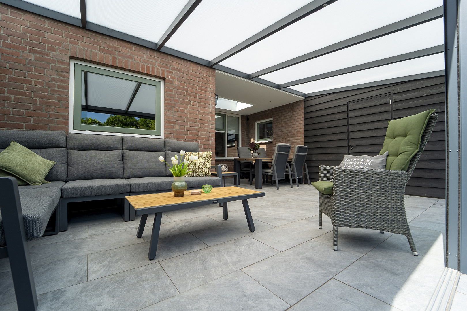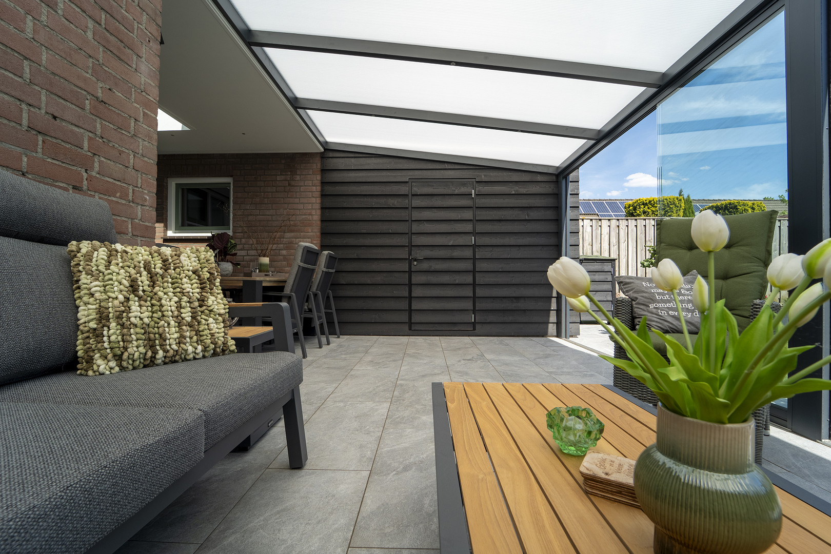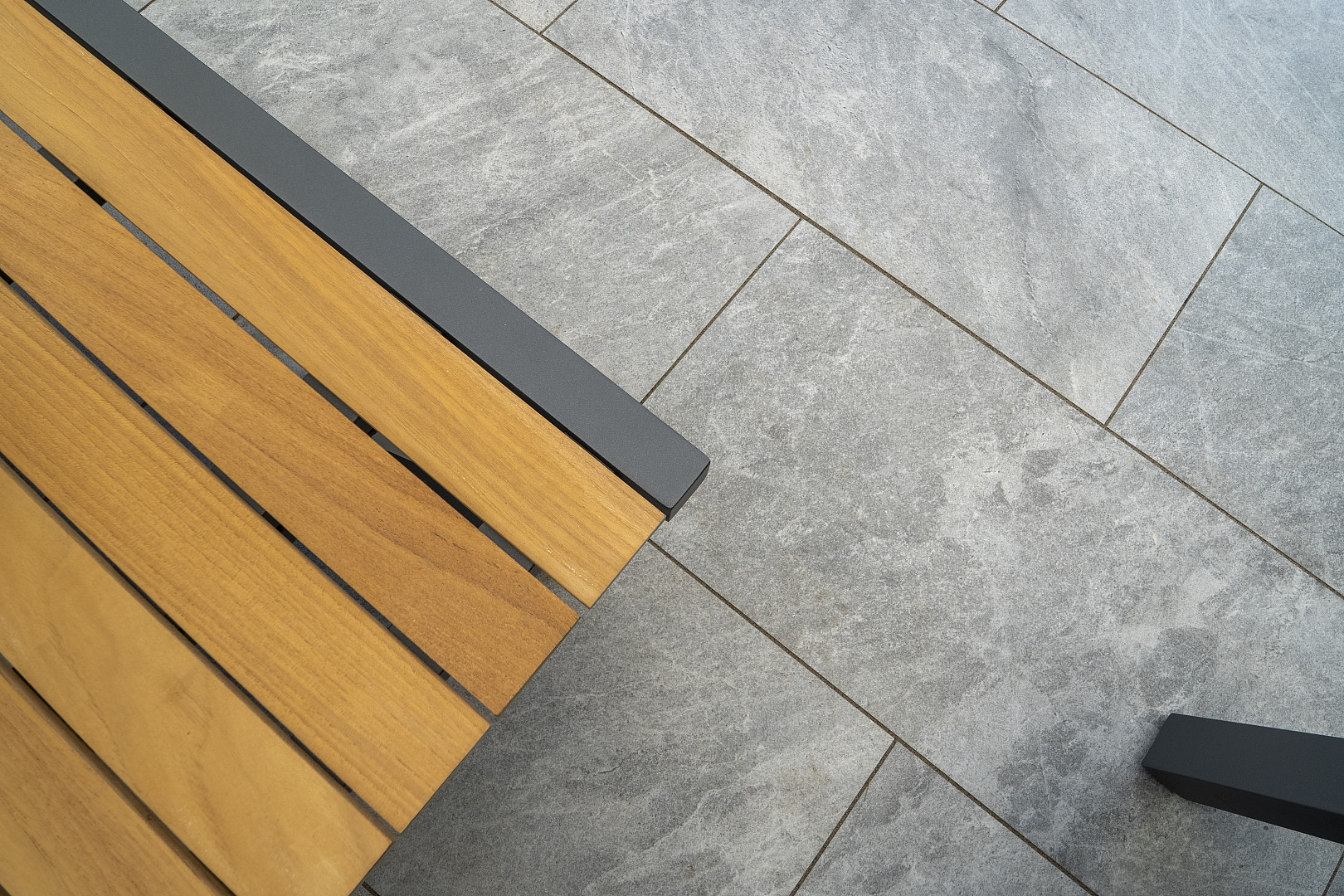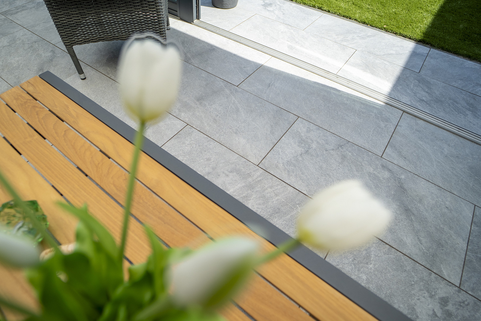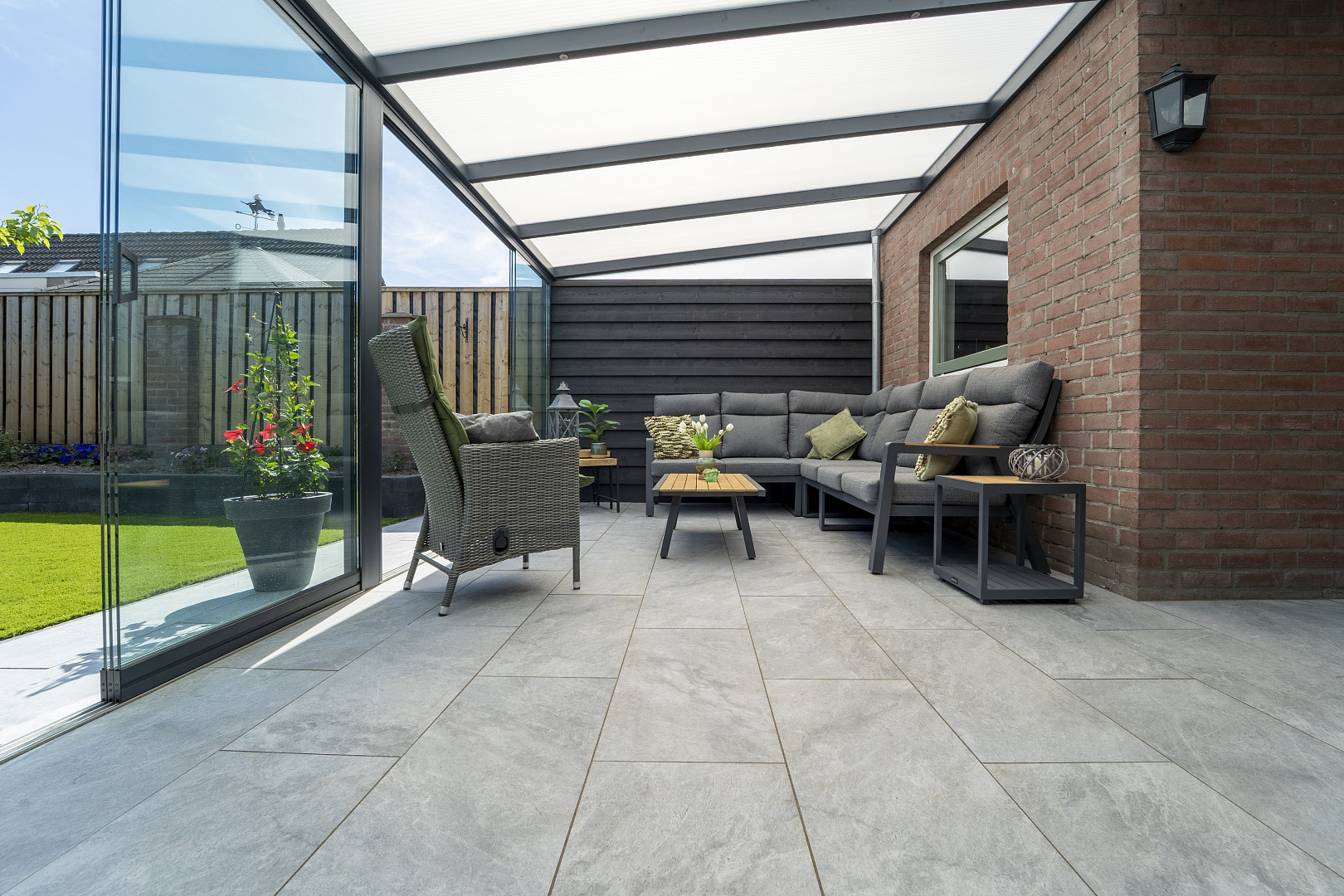 Combineer Cerasun Bergamo Azzurro met lichte houtsoorten, natuursteen of groene beplanting voor een frisse, moderne buitenruimte met een natuurlijke uitstraling.