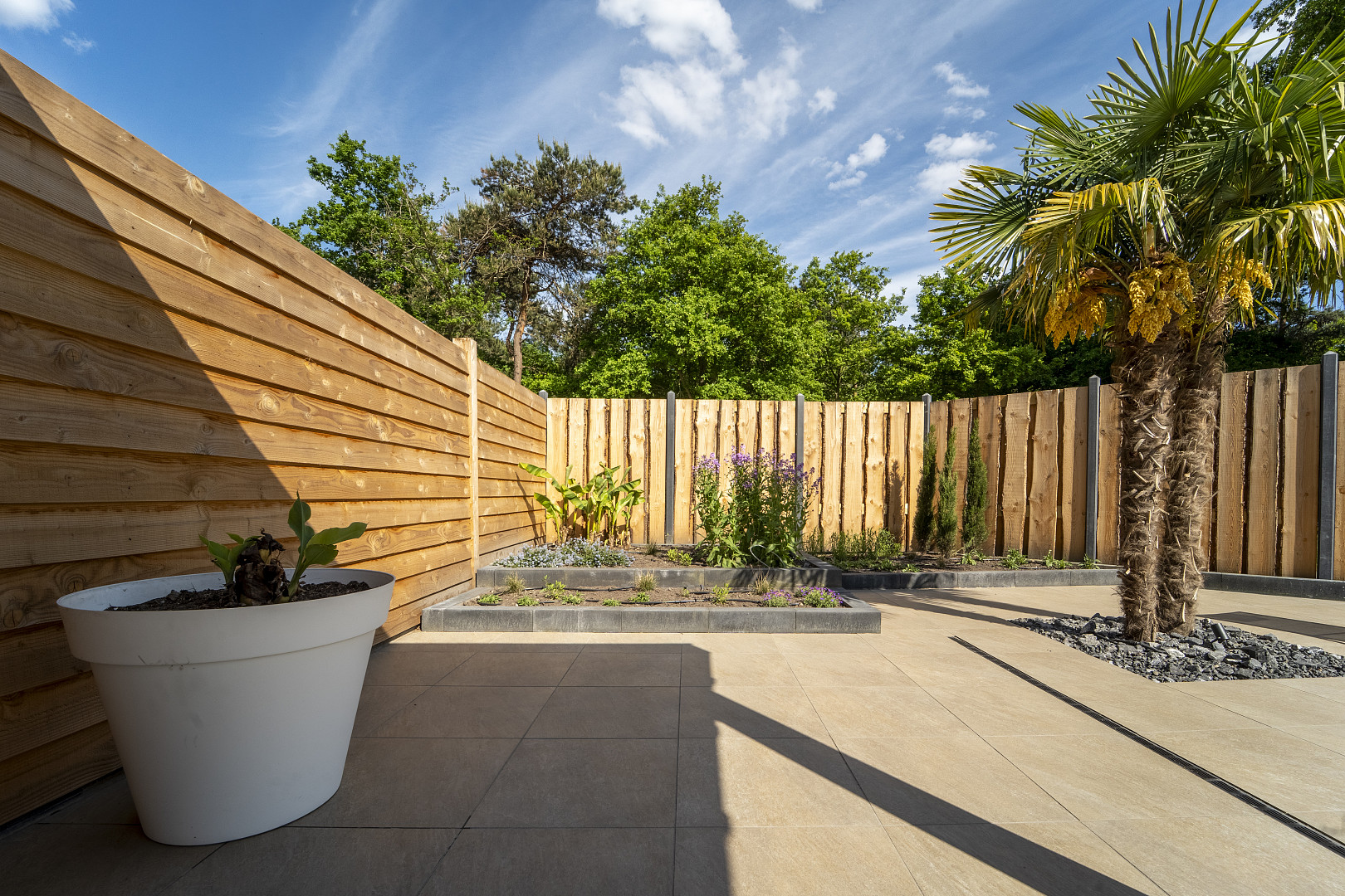 Combineer met lichte houtsoorten, natuursteen of groene beplanting voor een zonnige, mediterrane buitenruimte.