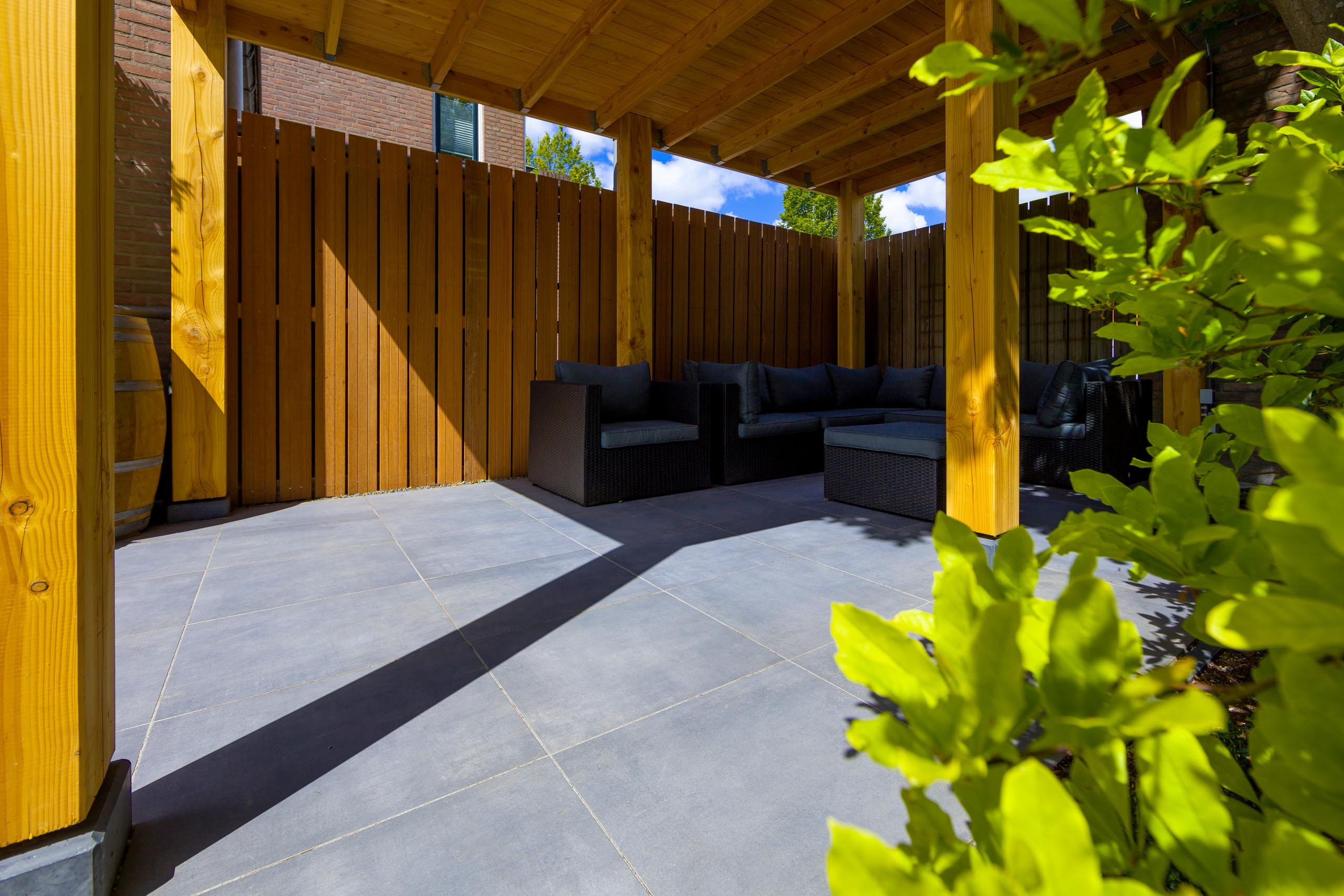 Combineer GeoCeramica Flow Smoke met hout, staal of groene beplanting voor een moderne, harmonieuze buitenruimte met een luxe uitstraling.