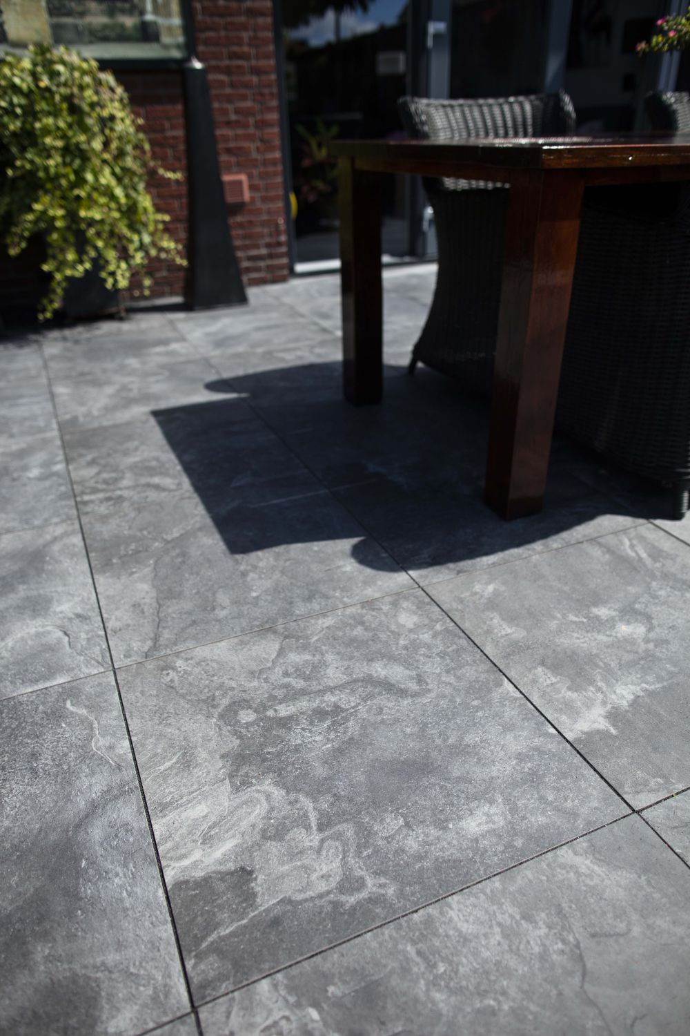 Combineer GeoCeramica Marmostone Black met lichte natuursteenaccenten, warme houtsoorten of minimalistische tuinmeubelen voor een exclusieve buitenruimte met een tijdloze uitstraling.