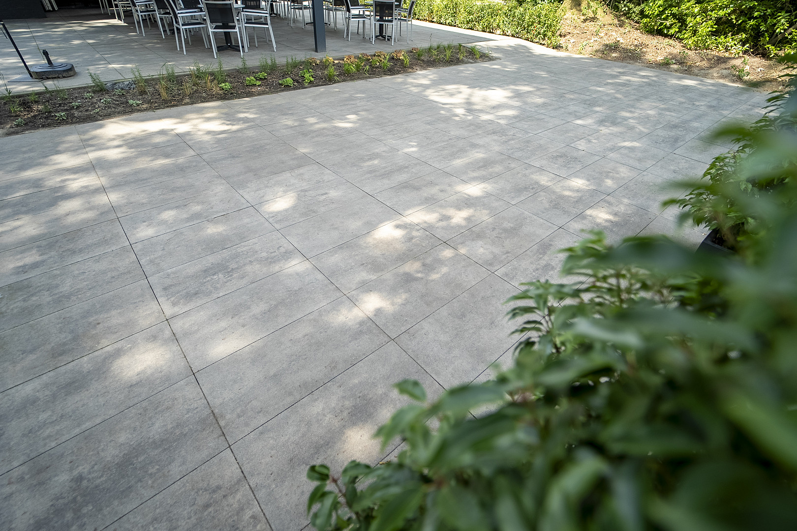 Door een dubbele toepassing van transparante, hoogwaardige impregnering worden terrastegels beschermt tegen vervuiling.