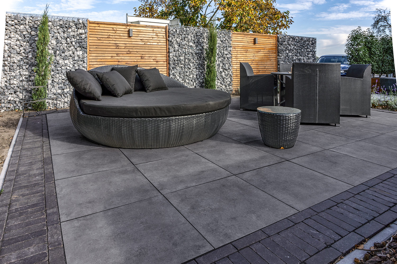 Door een dubbele toepassing van transparante, hoogwaardige impregnering worden terrastegels beschermt tegen vervuiling.