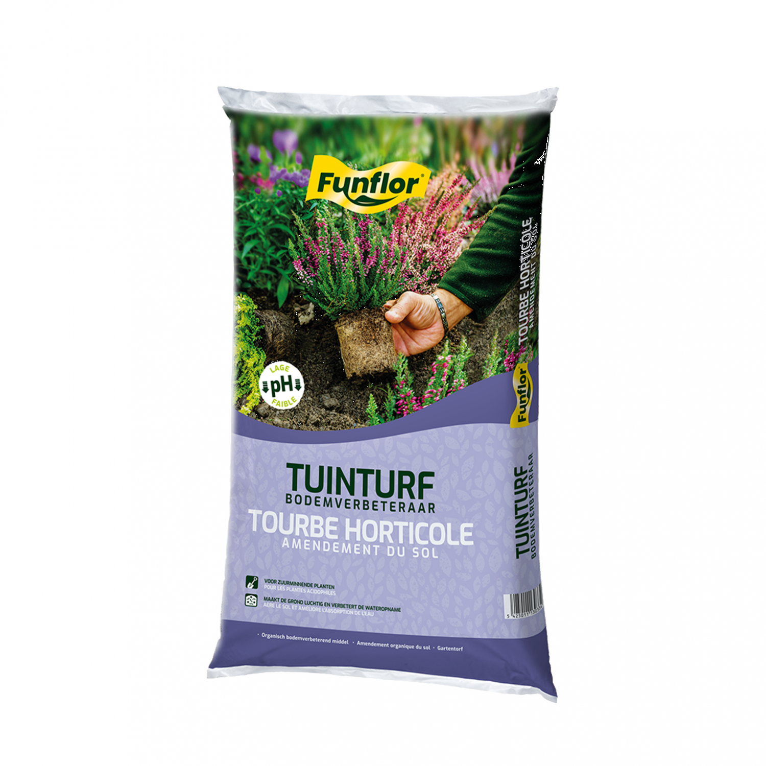 Tuinturf brengt de grond in een betere conditie en bevordert de luchtwaterhuishouding in de bodem. Door de lage pH (zuurgraad) is het uitermate geschikt voor structuurverbetering van zuurminnende gewassen, zoals Heide, Rododendrons en Azalea's.