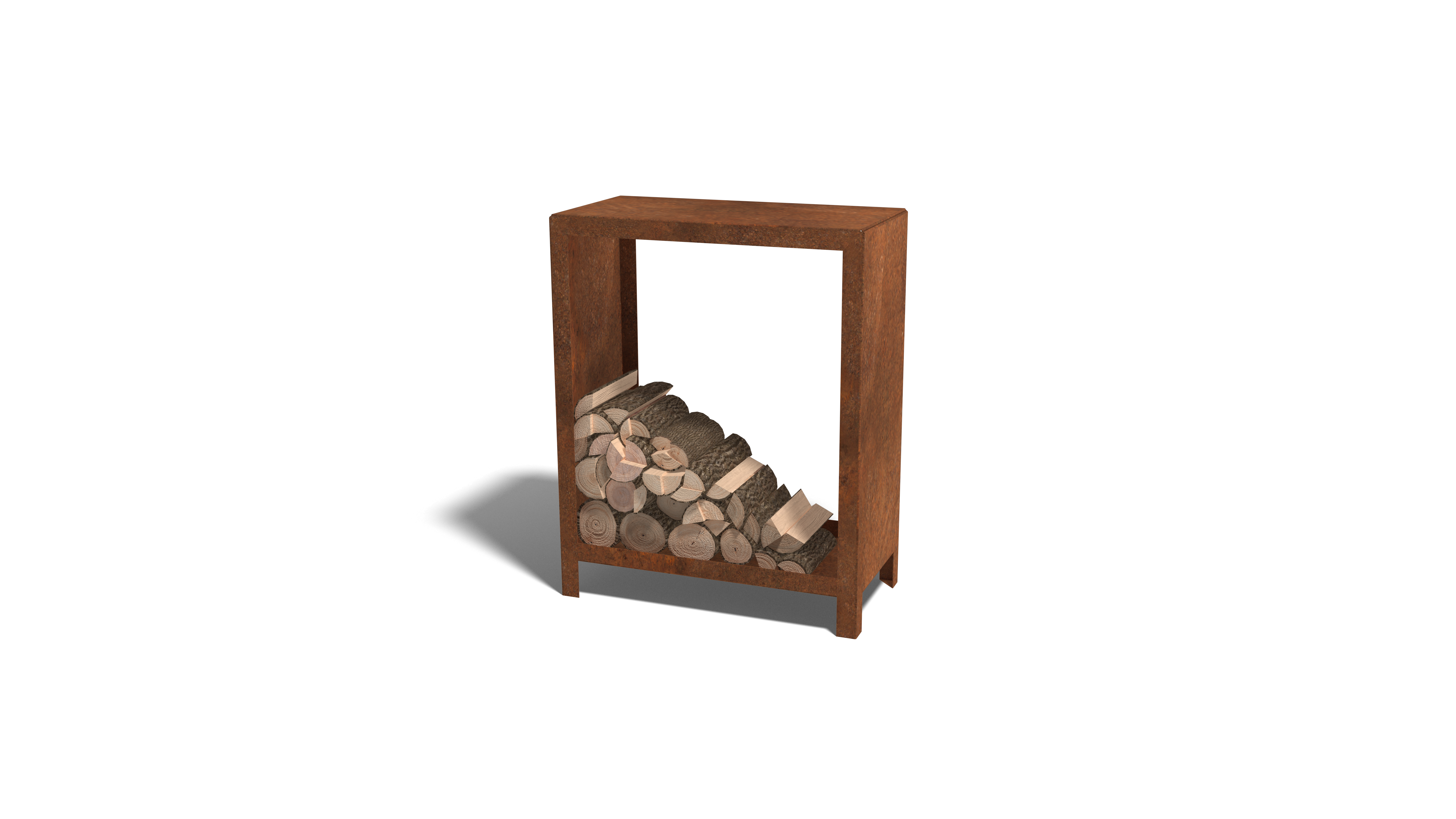 Deze houtopslag wordt vervaardigd uit hoogwaardig Corten-A staalplaat. Deze metaalsoort heeft als unieke eigenschap dat het een zeer dichte oxidehuid (roestlaag) vormt. Doorroesten is hierdoor onmogelijk. Door de dichte oxidehuid wordt het dieperliggende materiaal afgeschermd van zuurstof. Hierdoor wordt de oxidatie sterk vertraagd terwijl de corrosie zich wel voortzet. De cortenstalen houtopslag wordt ongeroest, in de grijze metaalkleur geleverd. De bruin/oranje roestlaag vormt zich binnen enkele weken tot maanden. Hier is geen behandeling voor nodig. Tijdens het roestproces kan de houtopslag afgeven. Cortenstaal is een metaallegering die bestaat uit ijzer en hieraan zijn koper, fosfor, silicium, nikkel en chroom toegevoegd.