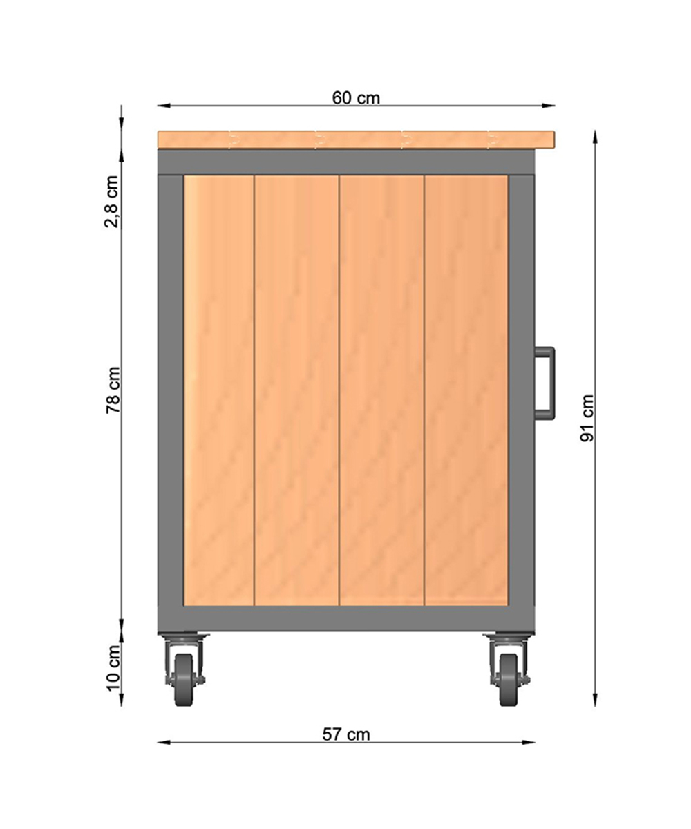 - Handgreep linkerzijde. Met de handgreep kun je de keuken verplaatsen of je kunt deze gebruiken om accessoires aan op te hangen.